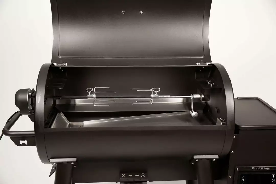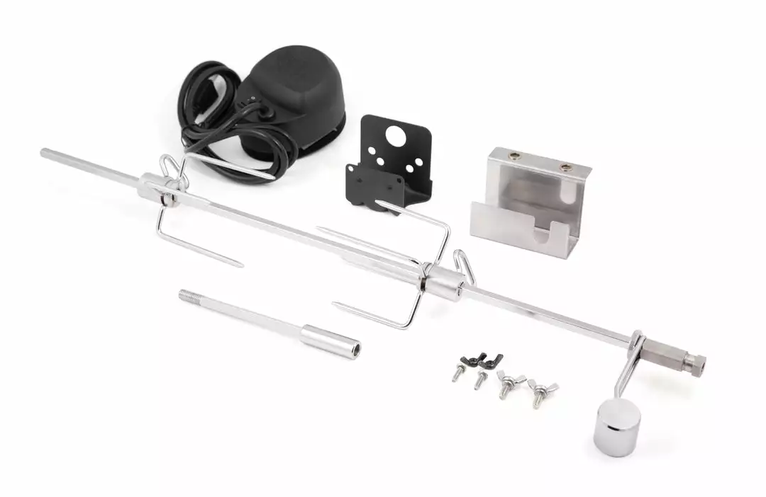 30.6-IN (77.72cm) pellet rotisserie kit includes a motor with on/off switch, heavy duty spit forks, counter balance, spit rod, and OEM brackets for Broil King® Pellet series grills. The spit rod consists of a 24.6-IN spit rod with a 6-IN extension if necessary.