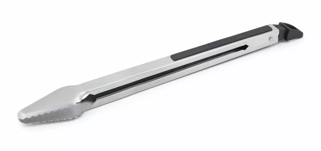 These 16-IN (40cm) soft grip, locking tongs have double scalloped ends. The locking mechanism also doubles as the hanging hook. The extra-long handle keeps your fingers out of the heat and the precision tip offers better control when flipping and turning items on the grill.