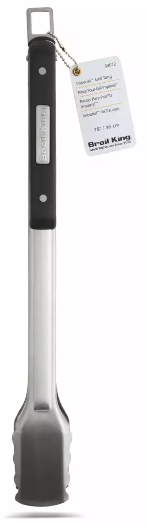 The Broil King® Imperial™ professional stainless steel locking tong is designed to combine the lifting function of a grill turner with the gripping power of grilling tongs. The locking mechanism also doubles as the hanging hook. The grill tong features high density resin handles inset with the stainless steel Broil King® logo.