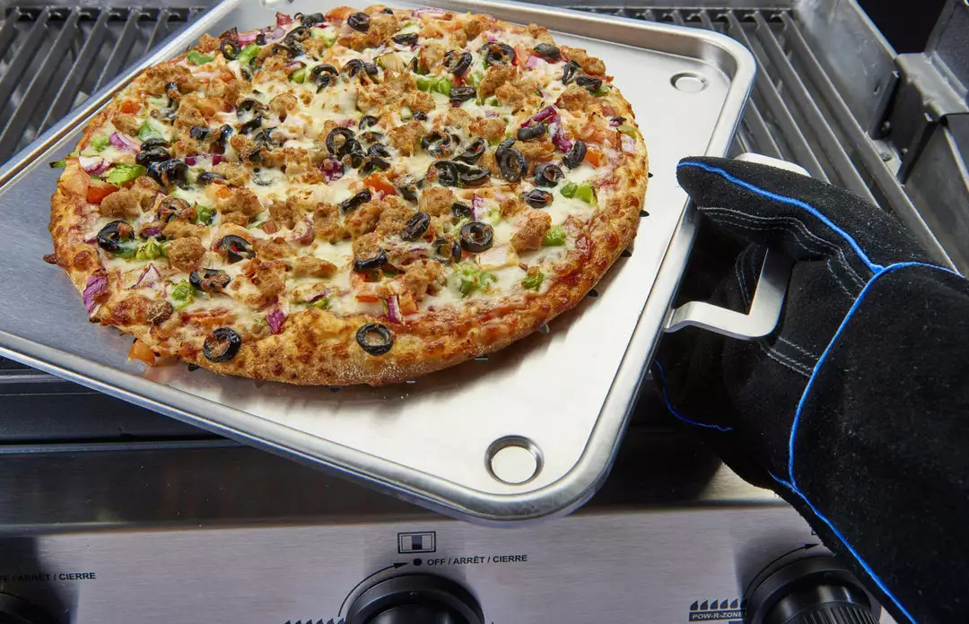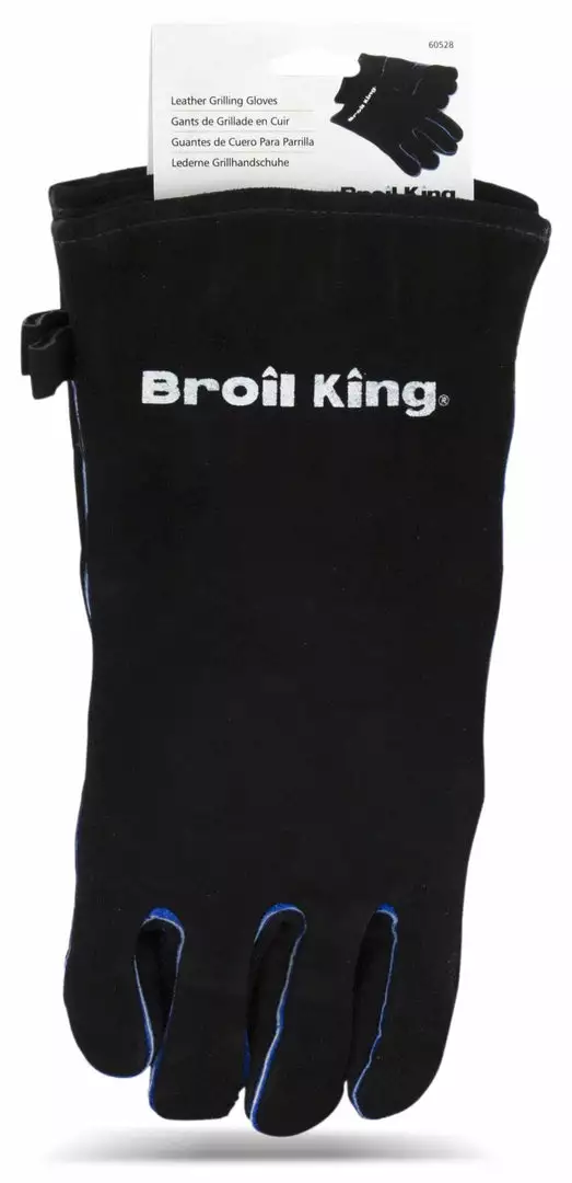 Heavy duty leather grilling gloves with extra soft linings. Black gloves and blue accents with a silk screen Broil King® logo. These deluxe grilling gloves become more comfortable the more that they’re worn.