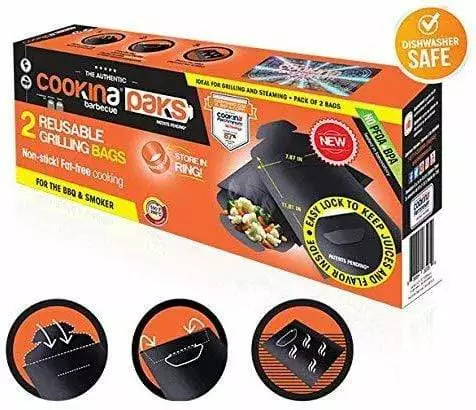 Pack of 2 reusable grilling bags. Ideal for grilling or steaming on the BBQ or smoker. Non-stick. BPA and PFOA free. Not for commercial use. Do not place in direct contact with flames, burners or heating elements. Do not use above 550oF (288oC).