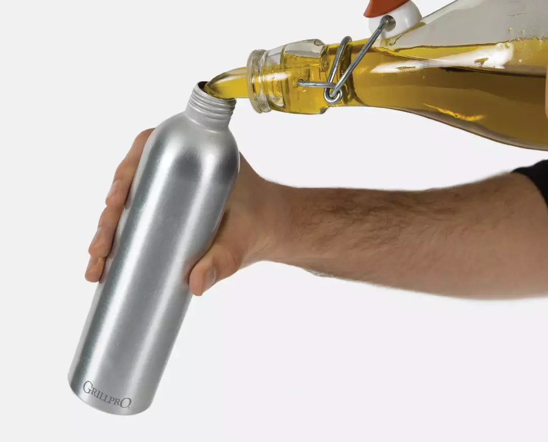A simple, handy oil spritzer used for coating cooking grids or basting foods. Use with any food quality oil. 12oz aluminum bottle.