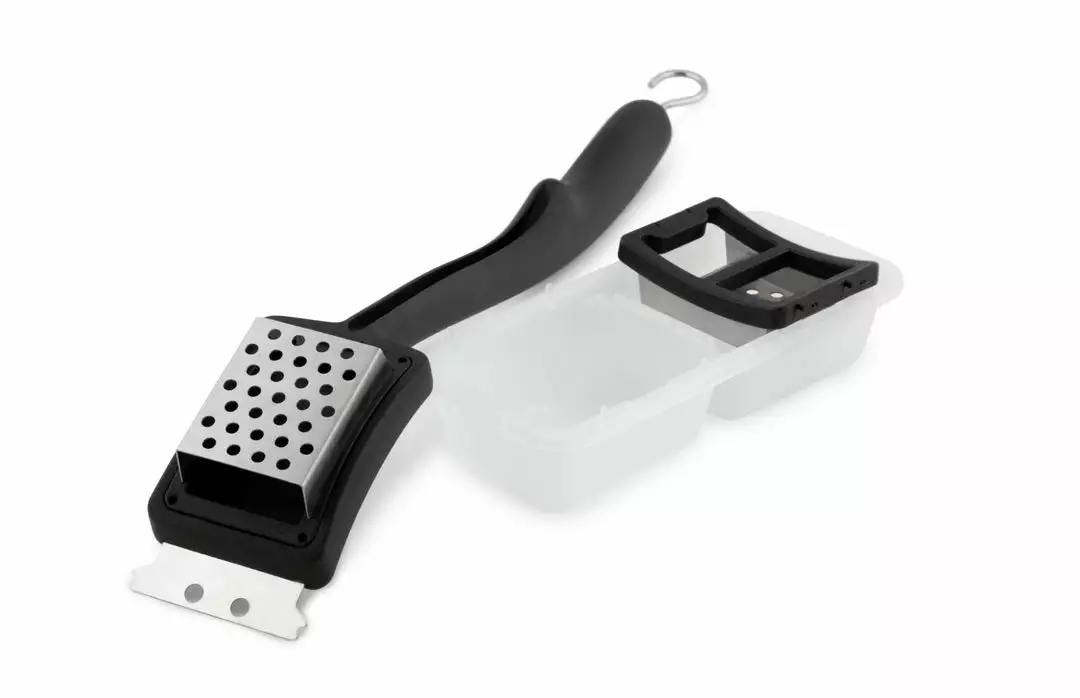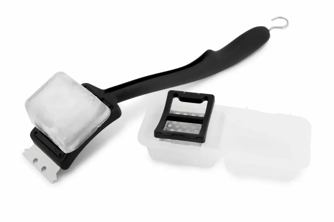 Revolutionary ice grill brush uses a formed ice block to clean cooking grids. Cleans around grids as it melts and vaporizes. Includes 2 heads and dual ice block tray. Use on warm or hot grill. Leaves no residue.