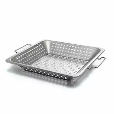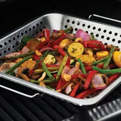 The porcelain coated square wok topper is great for grilling delicate and small items without fear of losing your food through the grates. The raised molded edges with handles keep your food in the topper and allow you to transport food to and from the grill without spilling.