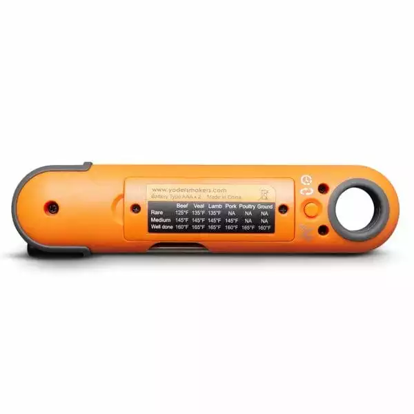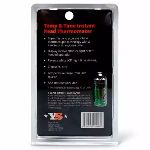 The Yoder Smokers Maverick PT-75 Instant Read Thermometer gives you a super-fast and accurate temperature reading on all your grilled and smoked mealtime favorites. And when we say superfast, we mean 2+/- second response time with the K type thermocouple technology. The thermometer is equipped with a built-in timer. Monitoring your meat in the dark is easy with this thermometer and the LCD read out screen.