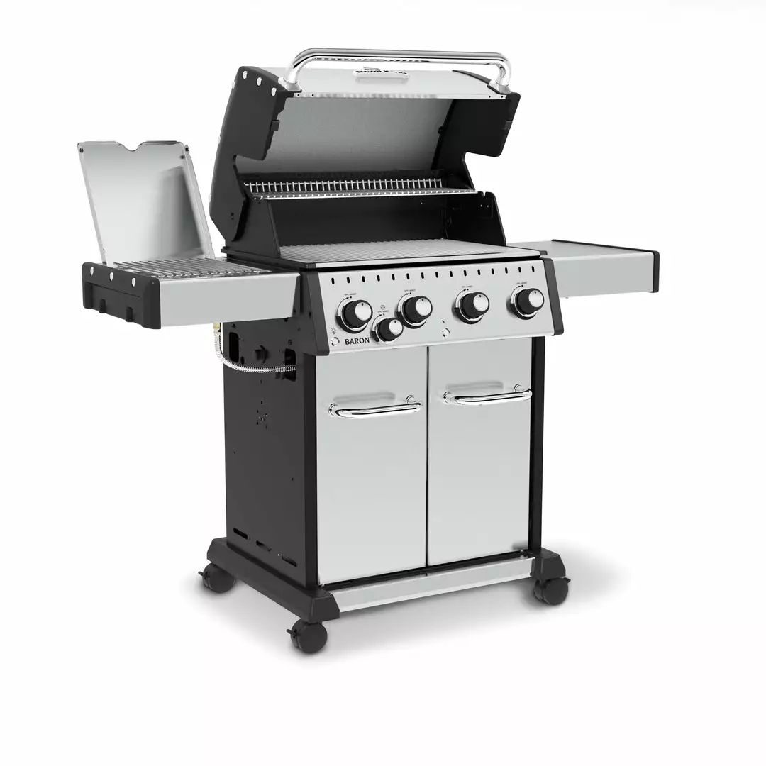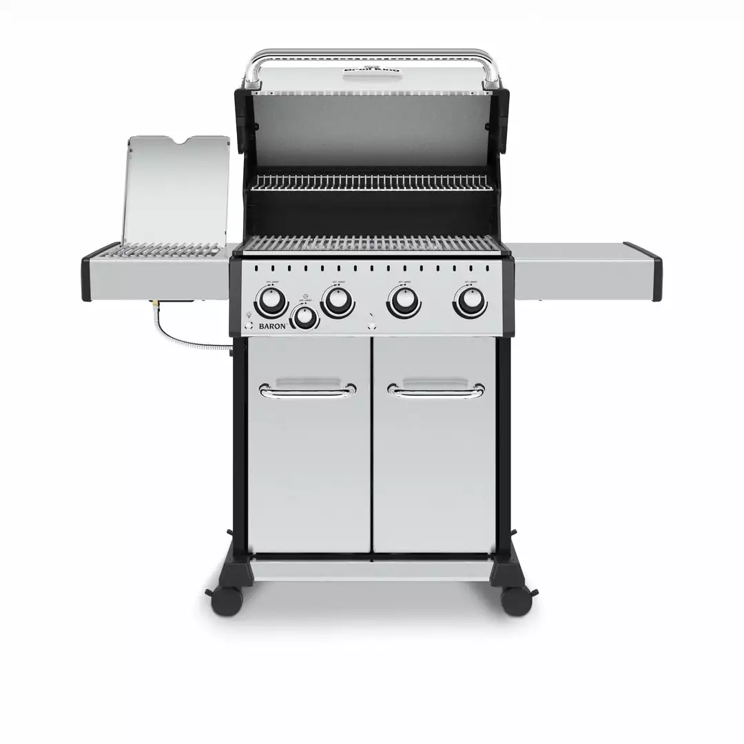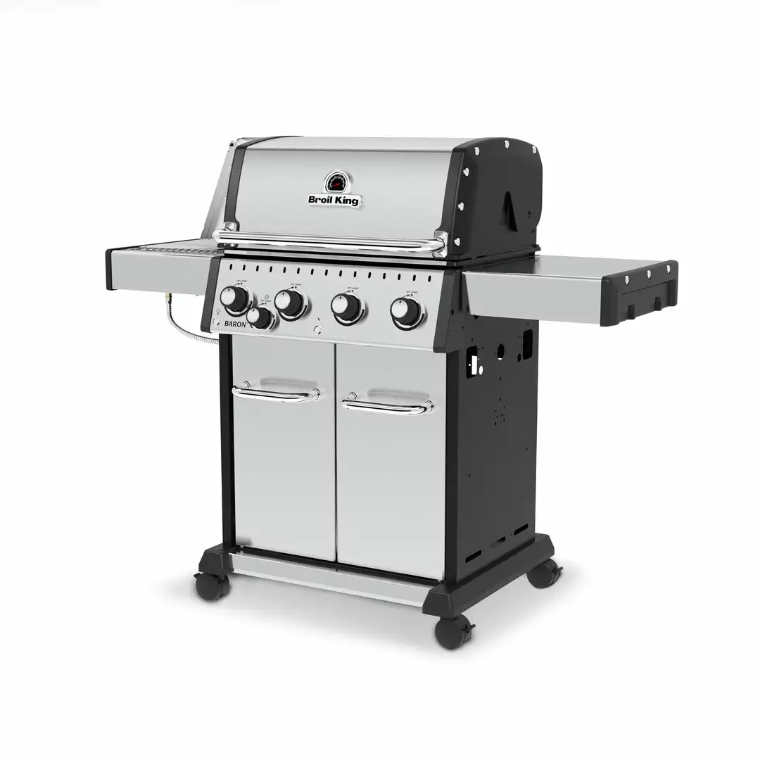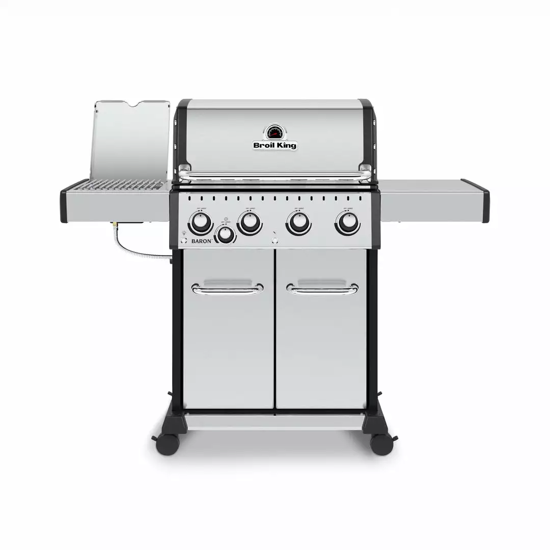 Baron™ S 440 PRO IR features 460 sq. in. primary cooking surface and includes a durable cast aluminum oven, 4 stainless steel Dual-Tube™ burners, illuminated control panel lights, stainless steel 8mm rod cooking grids, stainless steel warming rack, stainless steel Flav-R-Wave™ cooking system, and electronic ignition. The S 400 PRO IR Series features a powerful infrared side burner with solid stainless steel 8mm rod cooking grid, stainless steel drop-down side shelves, and an enclosed black cabinet base.