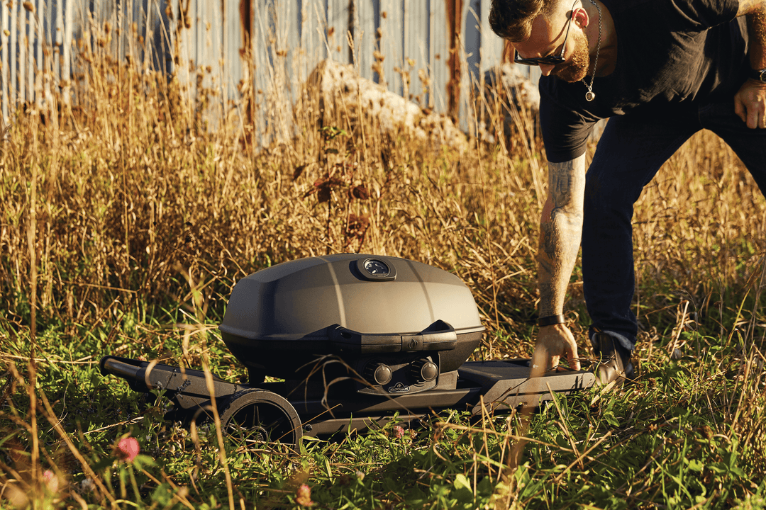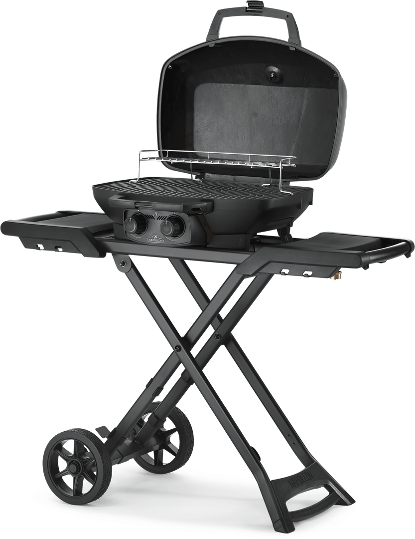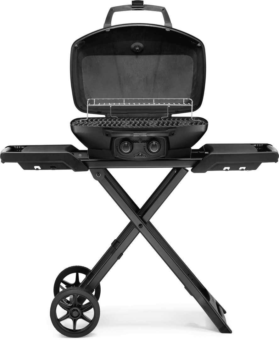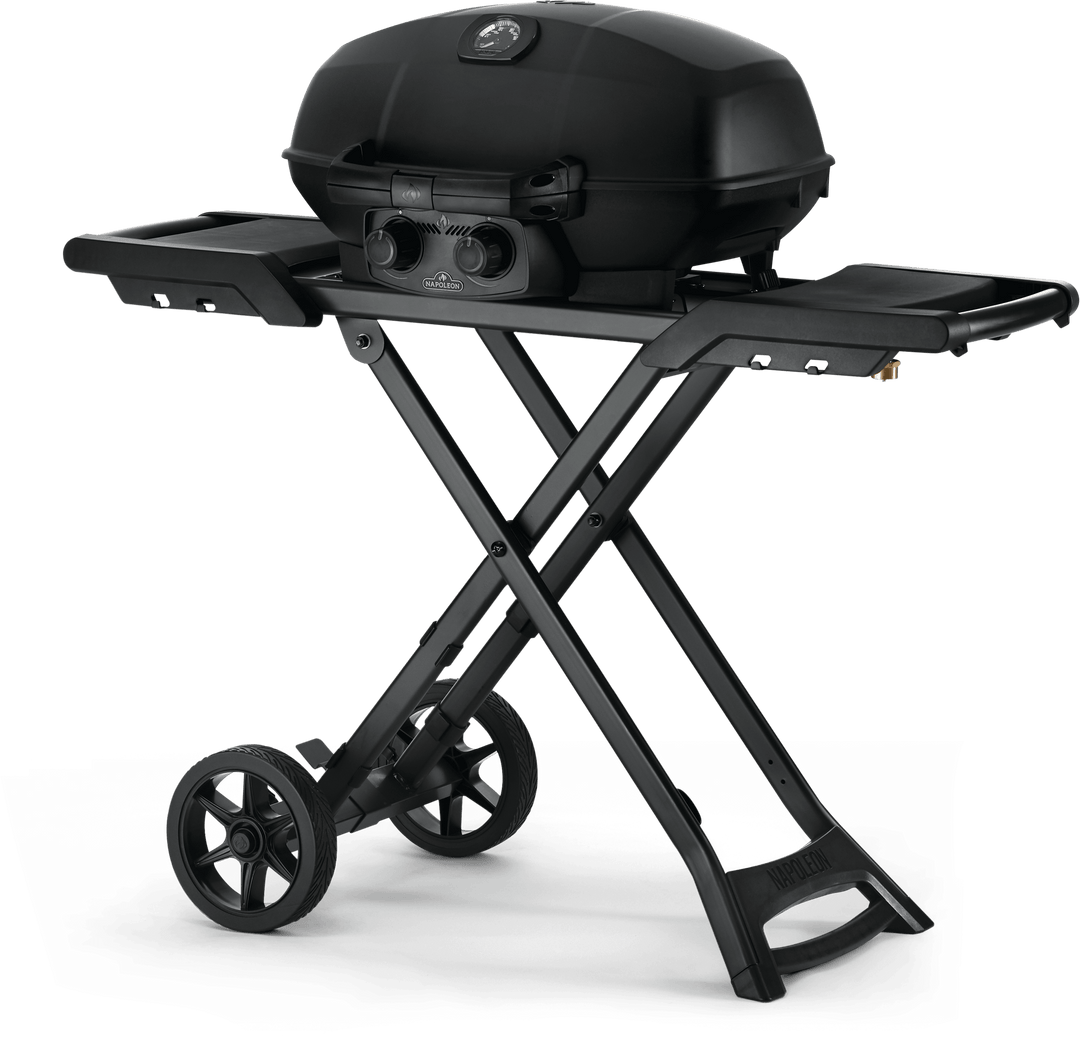 Grill on the go in style with the Napoleon Phantom TravelQ PRO 285 portable gas grill, featuring a luxurious matte black finish from hood to cart.
