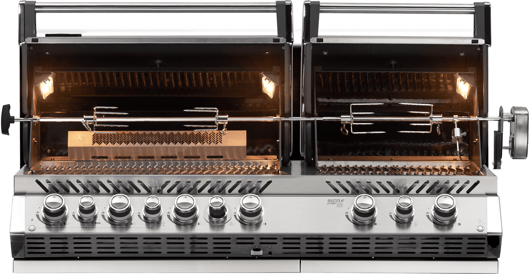 The Built-in Prestige PRO™ 825 BBQ with Infrared Rear Burner is beautiful and spacious, perfect for feeding a crowd, or just a couple people. Two heads are better than one, and the same is true for this grill. Two separate grill heads allow for a multitude of cooking options including direct searing over infrared heat, indirect cooking, and using the rear burner for perfect rotisserie meals. You’ll know it’s a Napoleon with the iconic WAVE™ cooking grids for those distinctive sear marks. Turn this grill into a smoker by using the integrated wood chip smoker tray. The LED Spectrum NIGHT LIGHT™ Control Knobs have near limitless color options making night-time entertaining a breeze, and they also glow red when the gas is left on as a safety feature. This means you always know which burners are lit, making it easier to get the perfect sear or the ideal indirect grilling position. Stainless steel construction with chrome accents provide unparalleled durability and style making this grill the crowning jewel of your outdoor kitchen.