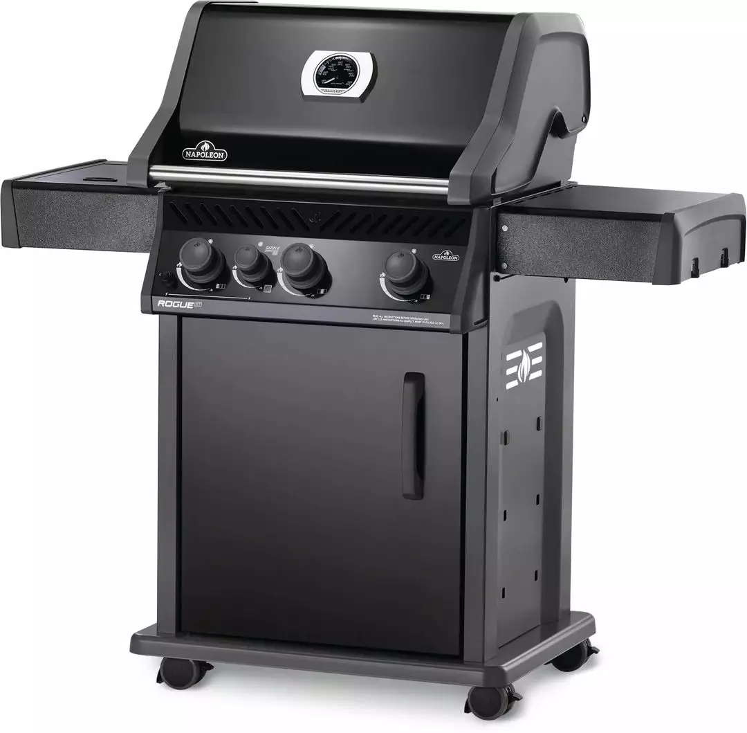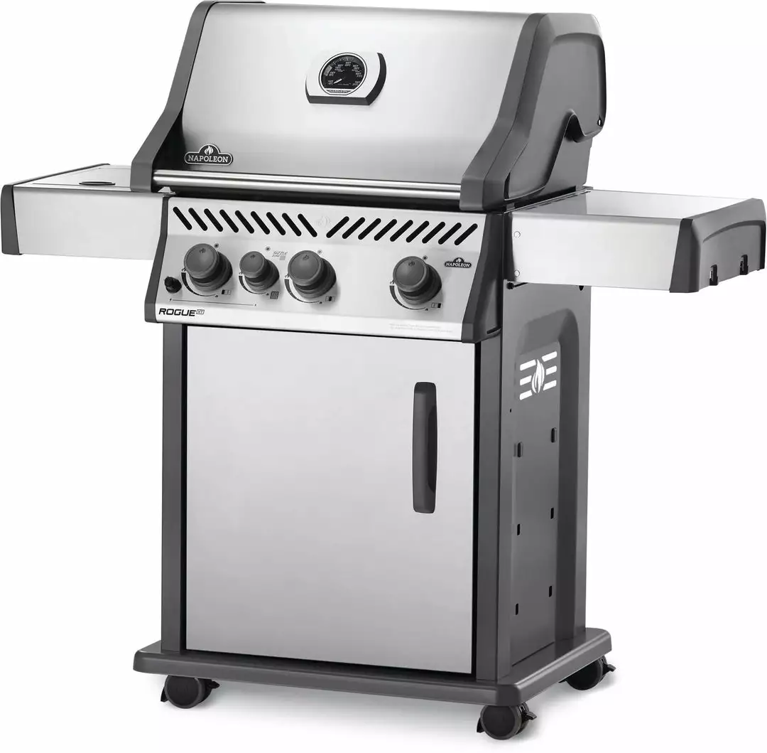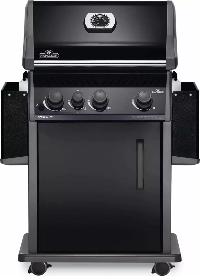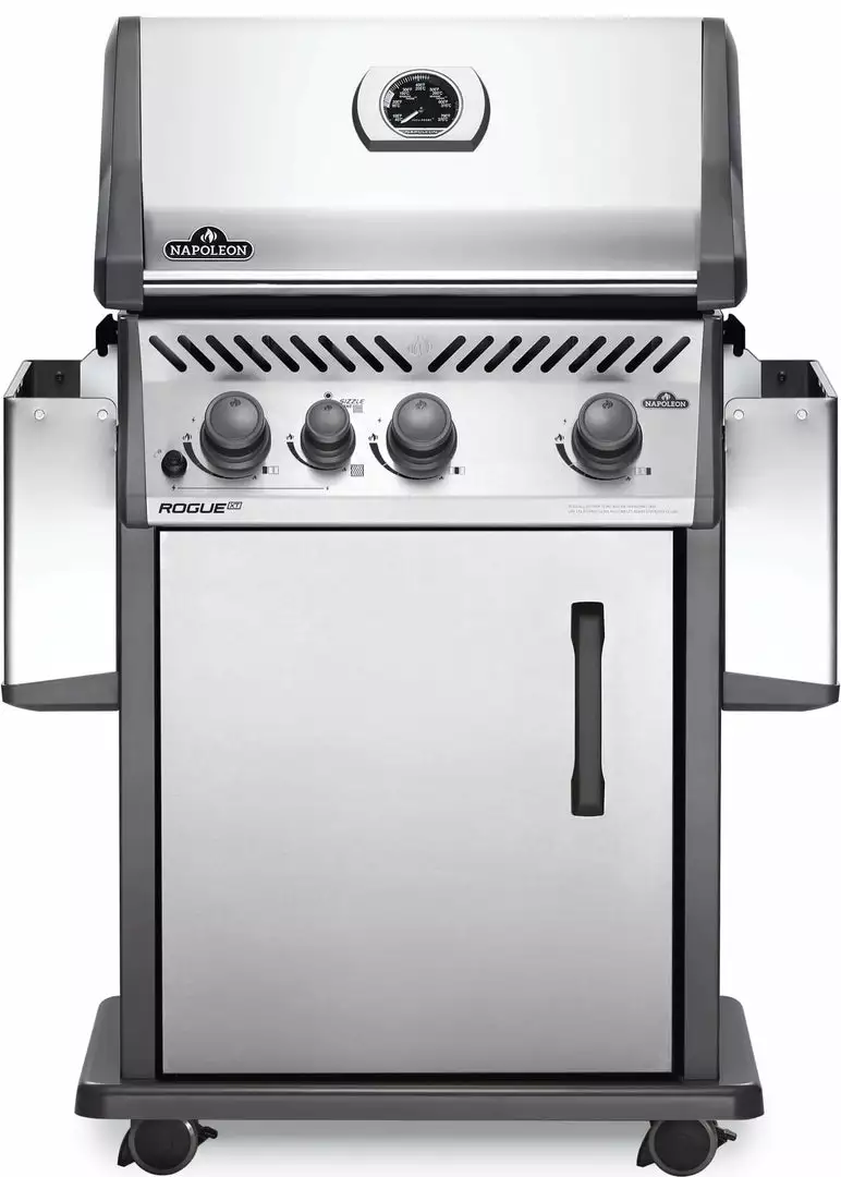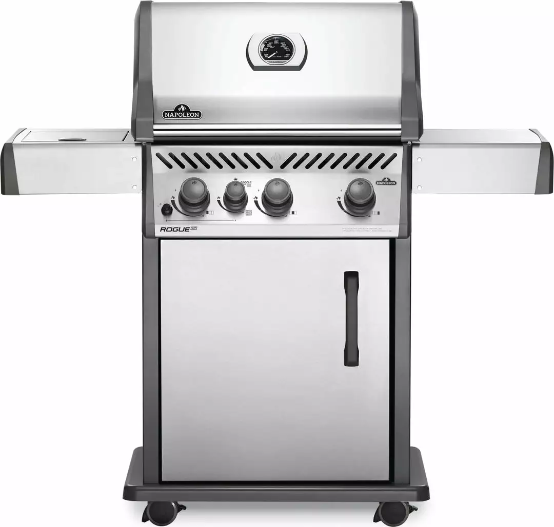 The Napoleon’s Rogue® XT 425 SIB BBQ with Infrared Side Burner available in Stainless Steel or Black color has three burners, cast iron grids and a high top lid. This grill lights easily, every time, with a battery-free ignition. Grill the perfect steak using the integrated sizzle zone side burner or use it to make sauces and sides while grilling, and searing on the main area. The durable materials are both stylish and easy to maintain.