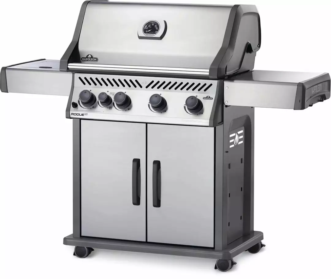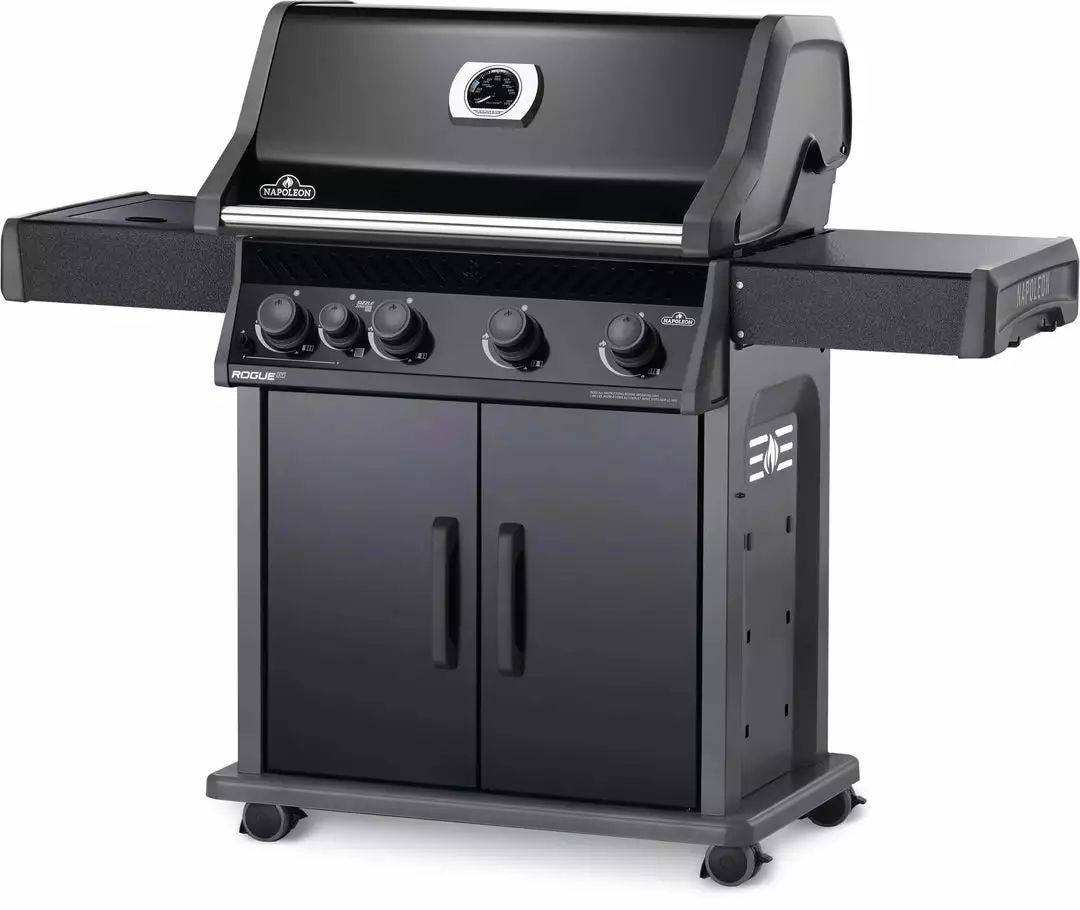 The Napoleon Rogue® 525 SIB BBQ with Infrared Side Burner available in Stainless Steel or Black color is a large and durable, easy to maintain gas grill. Featuring four main burners, stainless steel sear plates, cast grids and a high top lid, this grill has everything you need for gourmet meals. Sear restaurant-style steaks on the integrated sizzle zone side burner while generous side shelves provide plenty of prep space.