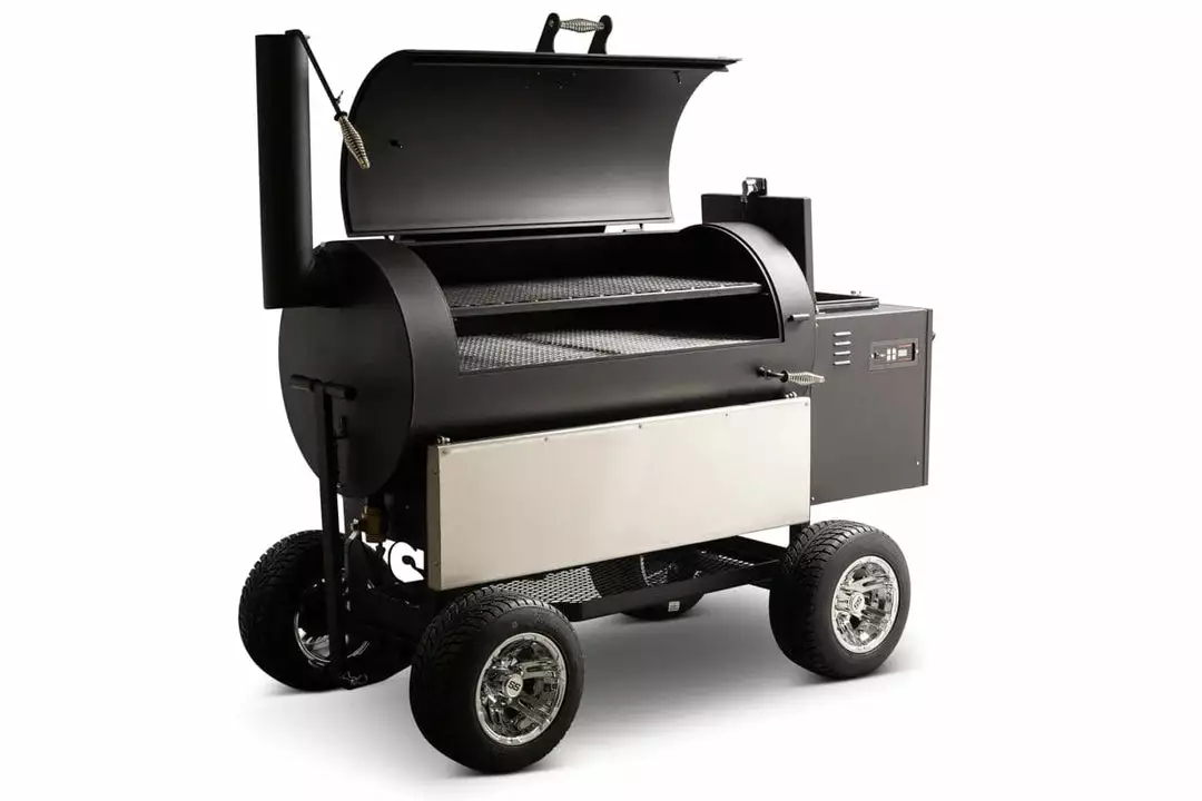 The 26″ x 54″ cooking chamber features two 25″ x 26.5″ main level cooking grates giving you 1,325 square cooking inches while the slide out second level shelf adds another 898 square cooking inches. The Cimarron was designed to easily cook an entire barbecue competition giving you the room you need to move food around as necessary and allow heat and smoke to envelop the meat, giving you better bark and bigger flavor. This fully loaded unit includes a 40 pound “Firebox-Style” hopper with a pellet dump feature and boiler-style door. The pellet dump allows for changing over pellets flavors or the ability to dump for those long trips! Are you ready?