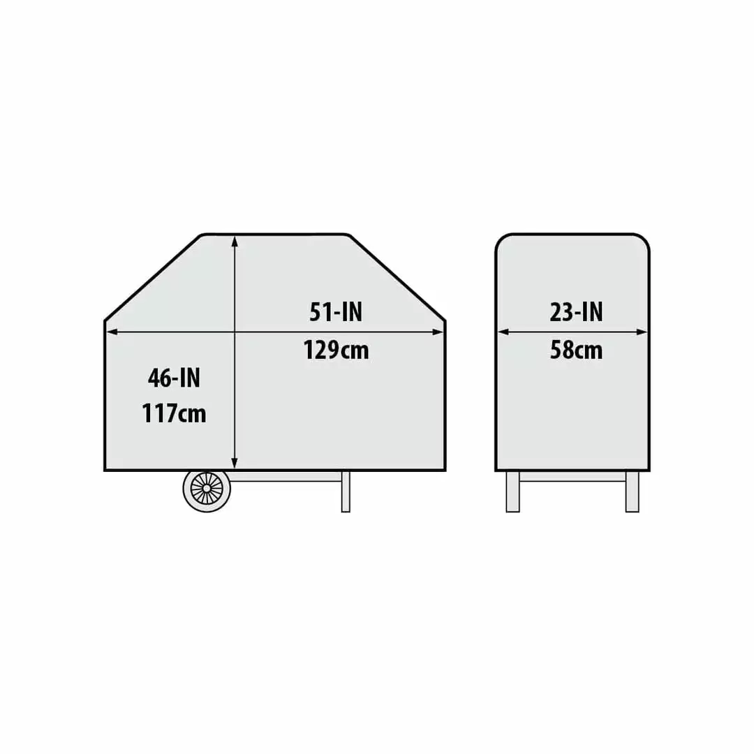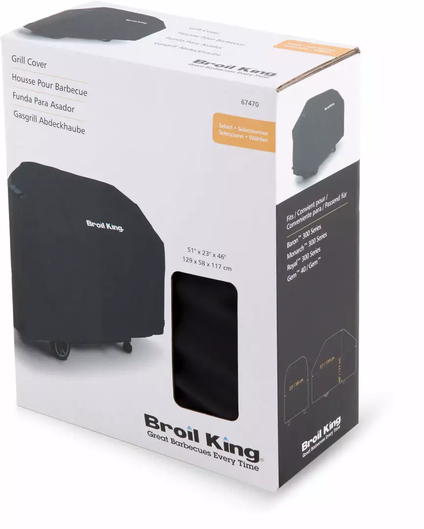 Broil King Select Series Exact Fit covers are crafted from durable and weather resistant PVC outer shell with a 500 x 300D polyester lining. These deluxe covers feature hook and loop closures, polyester handles, and the Broil King logo screened on the front.