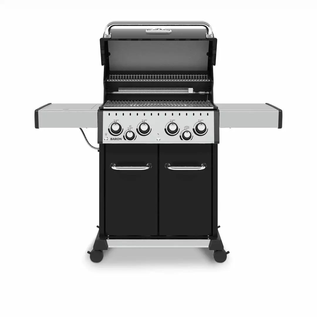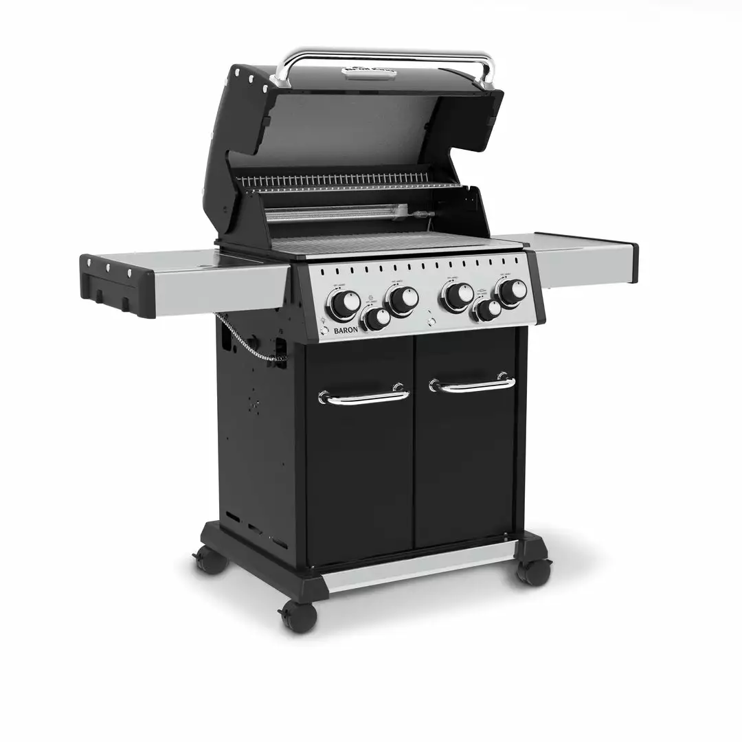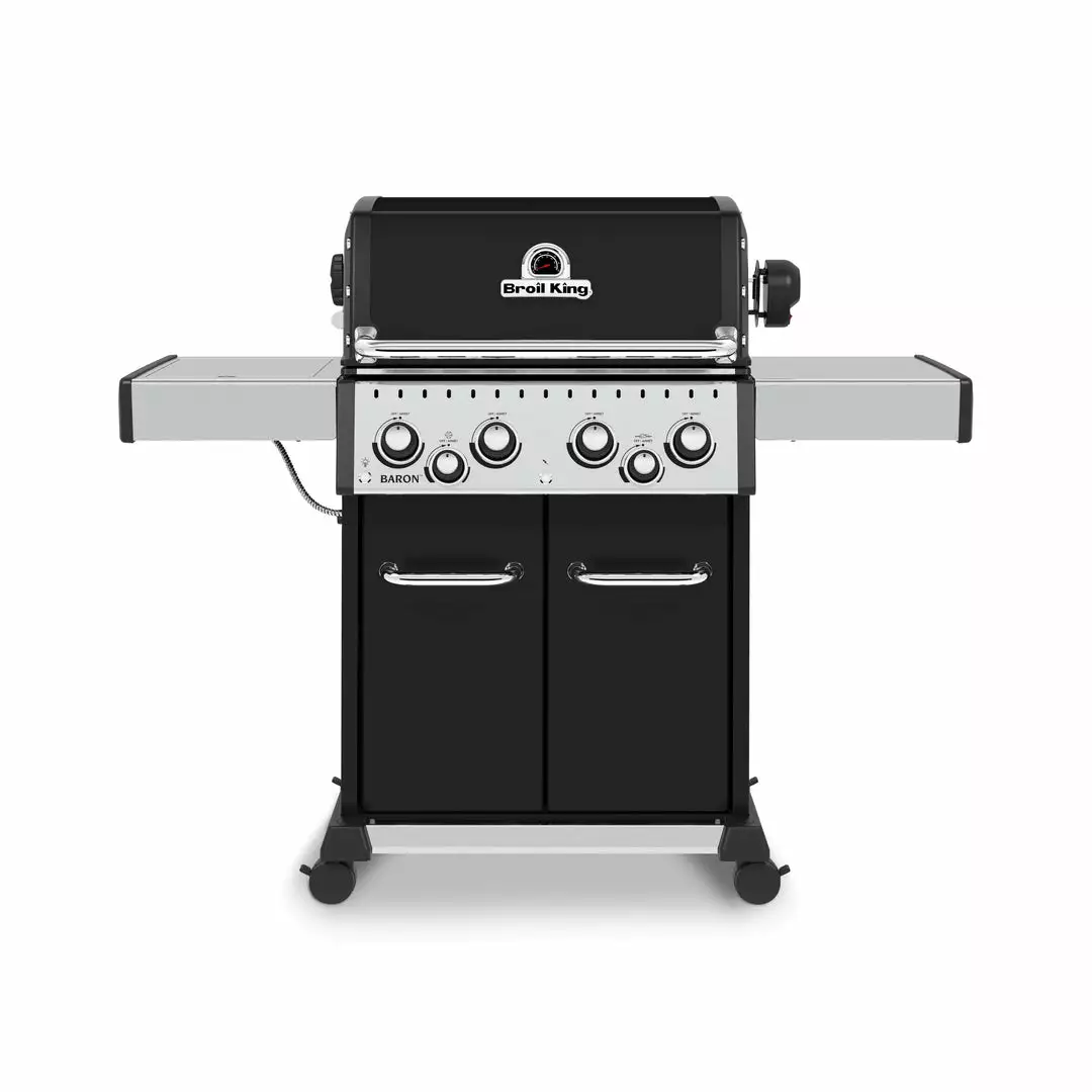 The Broil King Baron™ 490 PRO features 444 sq. in. primary cooking surface and includes 4 stainless steel Dual-Tube™ burners, thick 8mm stainless steel cooking grids, stainless steel Flav-R-Wave™ cooking system, and electronic ignition. The 490 PRO features stainless steel drop-down side shelves and enclosed cabinet base.