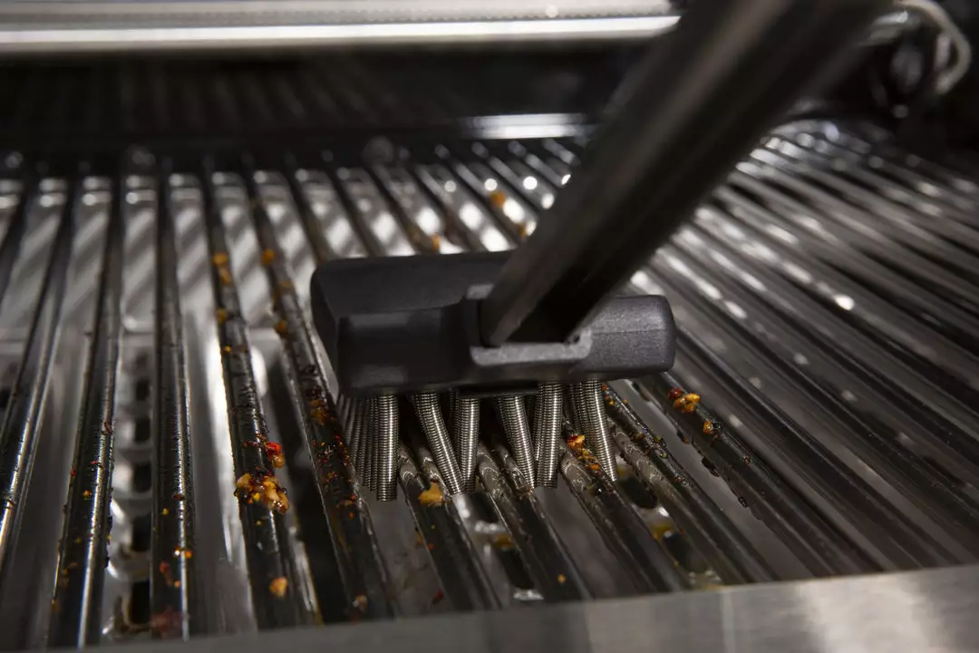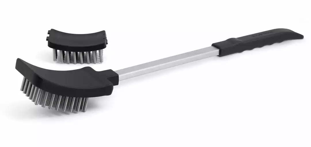 This grill brush features a hard ergonomic resin handle, and rigid stainless shaft and head. Integrated grime guard, stainless bristles.