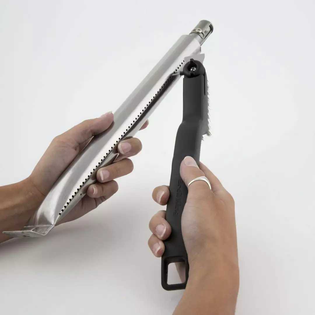 Burner health is the most critical component to cooking performance and even heat. Use the venturi brush to clean out the burners; bugs love to build nests inside them cutting off your gas flow. The fine detail brush is the easiest way to clean-up burners, the collector box, or any hard to reach spaces. The fine detail brush also has a needle tip to clean out any clogged burner tube holes – essential on rotisserie burner grills.