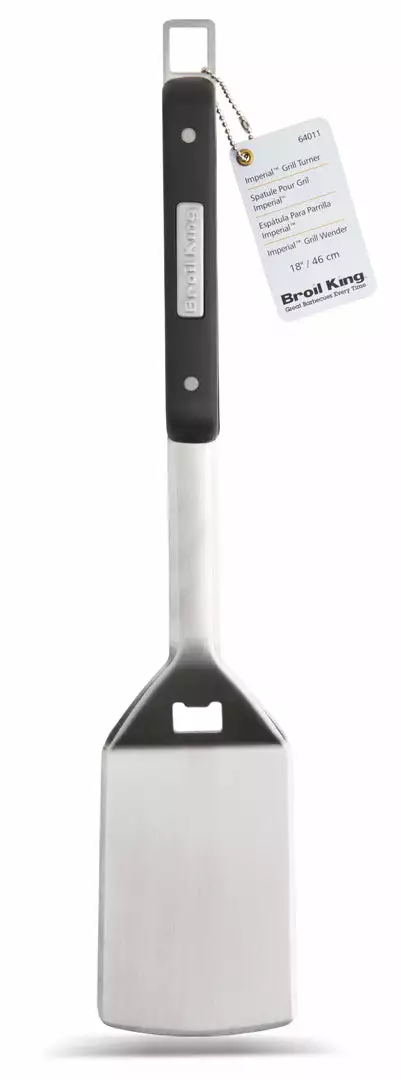 The Broil King® Imperial™ stainless steel turner is made with high grade 1.8 mm stainless steel and features an integrated bottle opener, hanging hook and a high density resin handle inset with the stainless steel Broil King® logo.