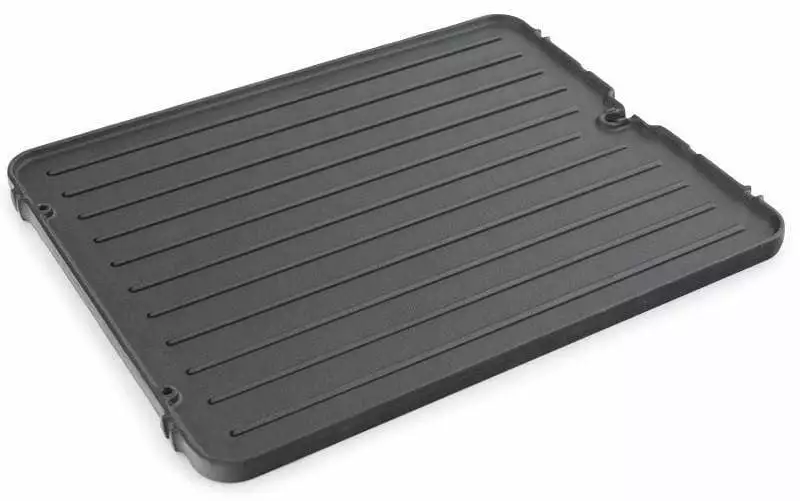 Reversible cast iron griddle with matte porcelain coating. Use in place of