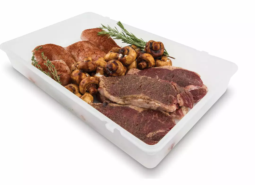 Take the whole grilling experience with you on the go! The Porta Chef™ tool set is completely self contained. The marinade or dirty tool storage container contains a turner, locking tong, grill brush, silicone basting brush, and 8″ / 20 cm chef’s knife. Top it all off with a reversible cutting board lid and silicone locking straps.