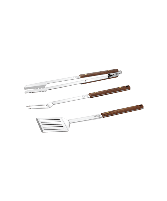 The DCS Cook Tools set (ATS-CK) features high grade stainless steel spatula, tongs and fork all with walnut handles and brass rivet detailing.