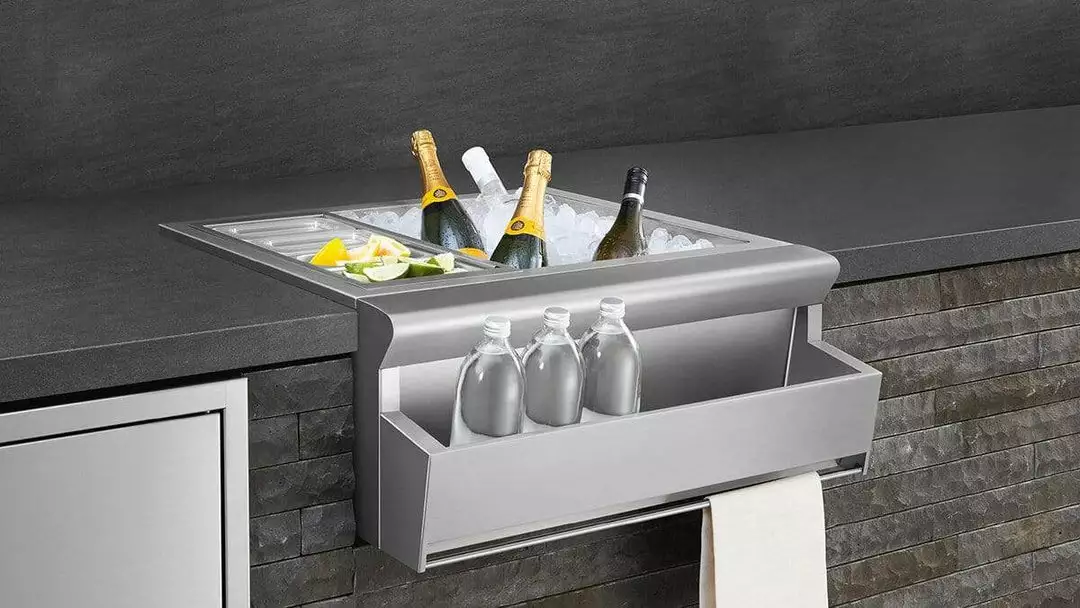 An ultimate entertainer`s feature, the 25″ DCS Beverage Chiller is a deep, fully insulated compartment that can hold up to 17 gallons of ice to chill your refreshments. The Accessory, designed to house 1-liter bottles, can be installed at the front of your Beverage Chiller, freeing it up to be used as an outdoor sink.