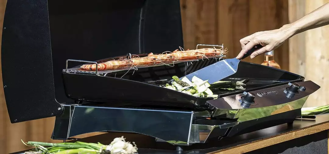 Stainless steel shelf for plancha ENO 75-Can be fixed on the hedges of the cooking plate – 2 service handles – 2 legs.