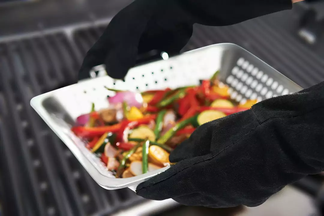 Heavy duty leather gloves protects your arm and hands while cooking over a hot grill.