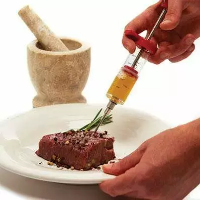 For injecting flavor and marinades into meat. Disassembles for cleaning. Stainless steel injector tip. Graduated injection chamber.