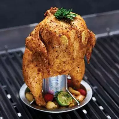 The best way to roast poultry on your grill! Includes one set of stainless steel supports that can accommodate most chickens and secure the beverage can; also features a stainless steel pan base. The set includes a silicone basting brush.