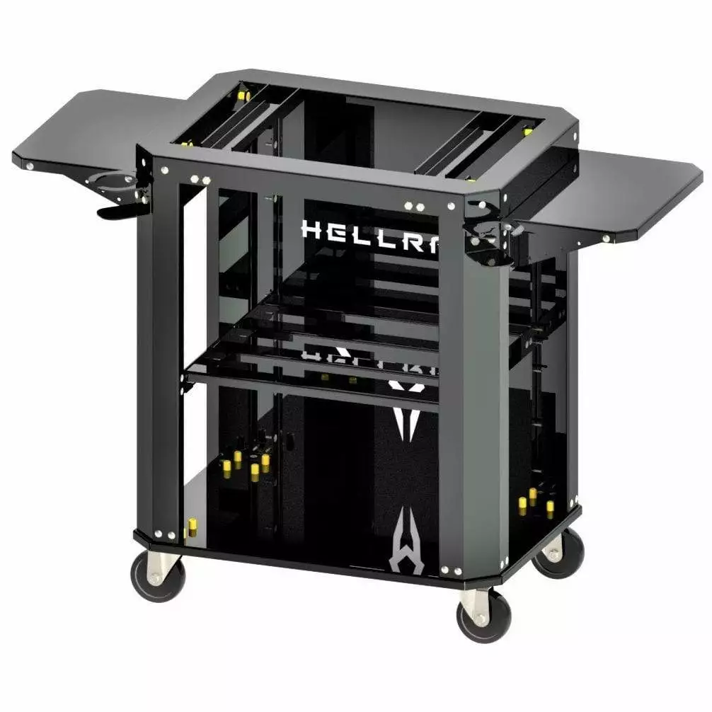The Yama Cart: Features Semi Gloss Black paint, heavy duty construction made from 11G and 16G Structural Steel, German Made 4 locking swivel casters, able to add or remove Yama via a quick attach system, twin cup holders and room for two boxes our Tex Mex Mix Charcoal.