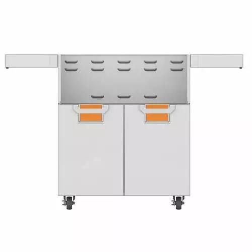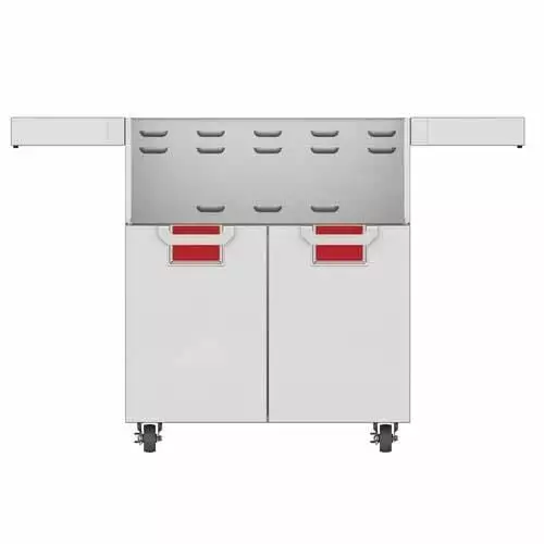 This grill-ready cart matches the 30” built-in grill in heavy-duty form and function. Fold-down side shelves offer extra work space when you need it. The two-door design allows easy access to gas tank and grilling tools. Commercial-grade casters deliver easy maneuverability.