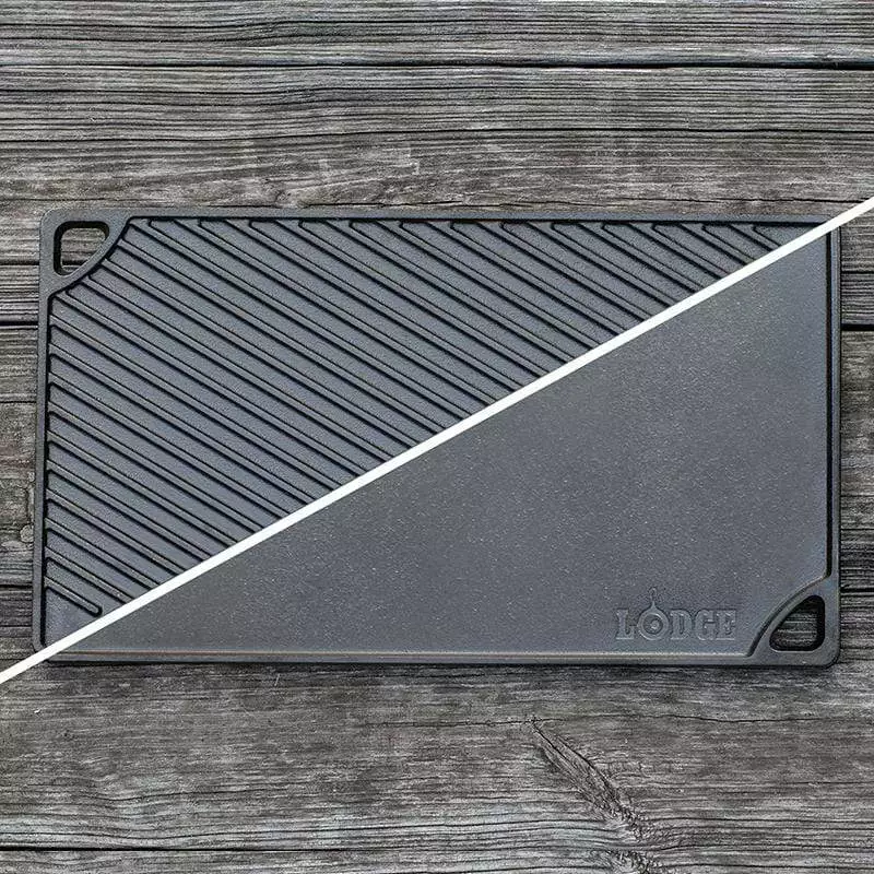 This double-burner Reversible Grill/Griddle functions as a dual cooking surface with both a smooth griddle and a ribbed grill. Fits over two stovetop burners. When used on the stove, set both burners to the same temperature for even cooking and excellent heat retention. Seasoned and ready to use.