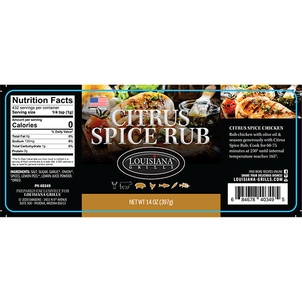 This elevated take on a traditional lemon pepper pairs real lemon peel with a medley of herbs like sage, thyme, rosemary and parsley. A great all-purpose blend for grilling, the Louisiana Grills® Citrus Spice Rub compliments grilled fish, chicken veggies and more.