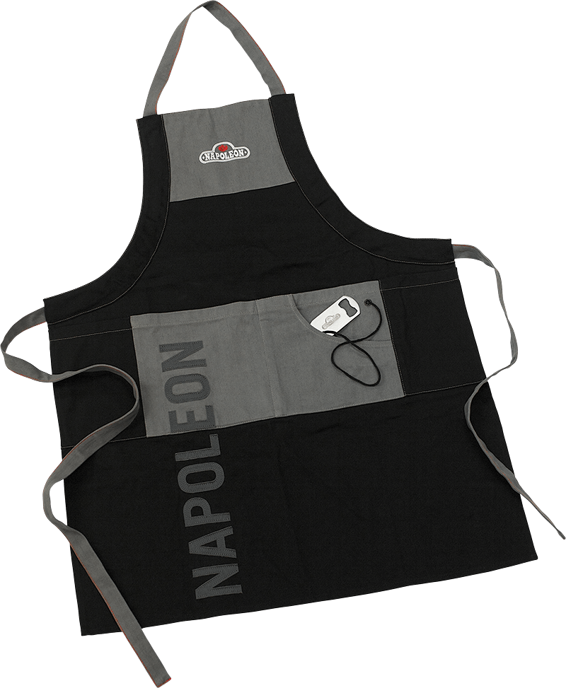 Grilling isn’t always a clean job. Protect yourself with a Napoleon Grilling Apron and show your love for your Napoleon Grill! The heavy-duty canvas protects you and your clothing from splatters, spills and spitting food as you grill up a storm. Fashionable in black and grey, with Napoleon in big letters, this one size “ fits most, apron will match you, your grill and your outfit. Keep your favorite tools handy with the large front pockets. Make sure that you’re the grill master with the handy added bottle opener too.