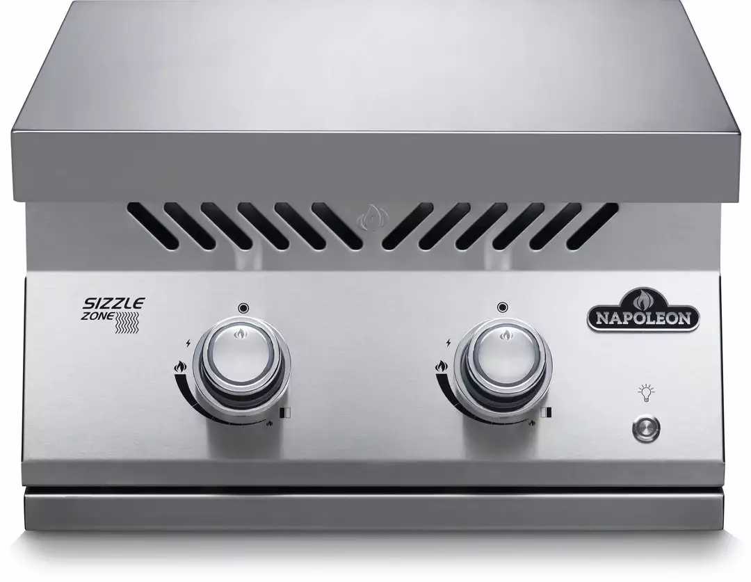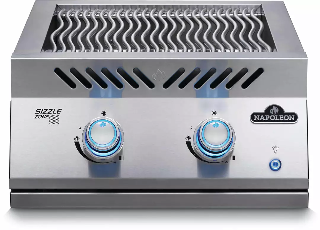 The Infrared SIZZLE ZONE can be used to produce the perfect sear on meat or used to create sides and sauces while the main grill is in use. This 18-inch, dual burner, drop-in Infrared SIZZLE ZONE burner provides loads of space to sear succulent steaks to restaurant-quality perfection. Made from the same quality of marine-grade stainless steel as the 700 Series built-in grills, this drop-in side burner matches your custom outdoor kitchen. These burners provide stylish longevity and were built with ease of install in mind. Virtually maintenance-free 7.5-mm cooking grids deliver the ICONIC WAVE sear marks that tell your meal was cooked on a Napoleon. Ignite the burners one-handed using the JETFIRE instant ignition system. The ergonomic NIGHTLIGHT control knobs which provide ambiance and safety, glowing a glorious blue and changing to red when burners are in use.