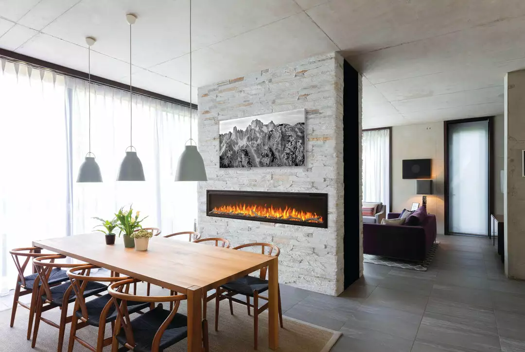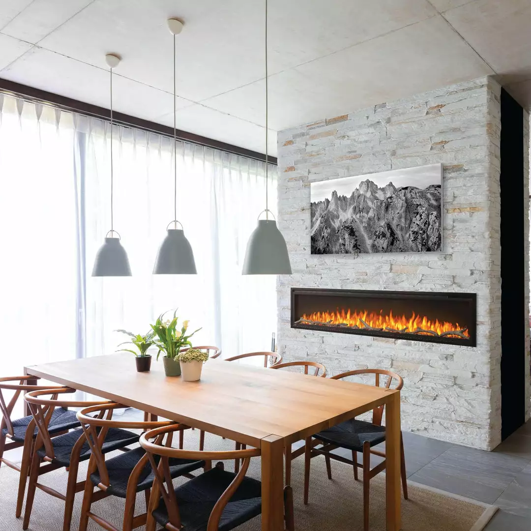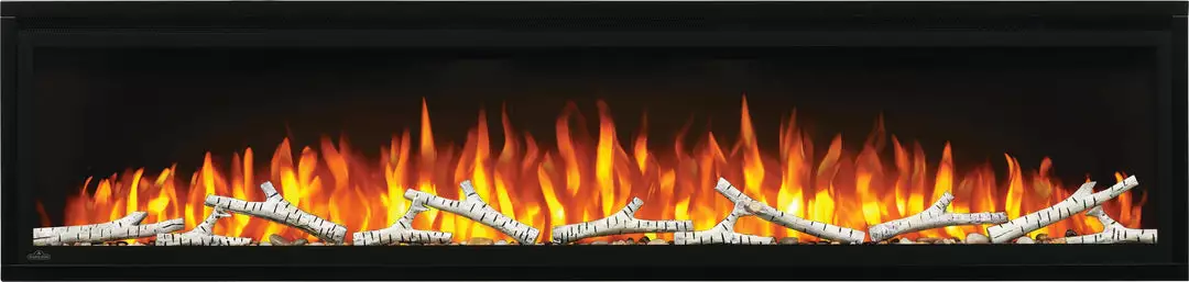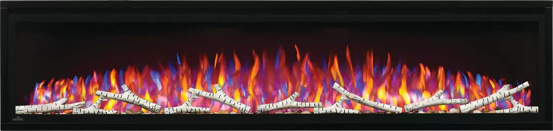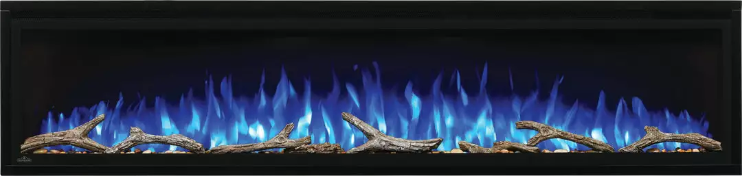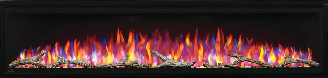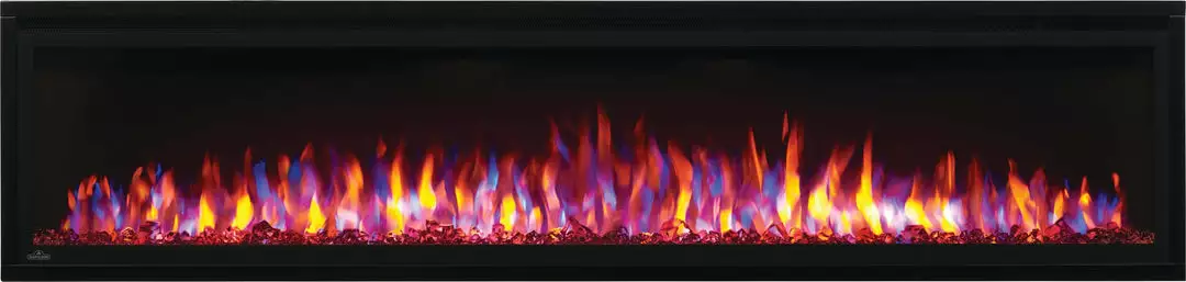 Make a statement with the Napoleon Entice™ 72 Electric Fireplace. This fireplace puts out an incredible amount of heat, glittering with multicolored flames and a crystal ember bed. You don’t need a specialist or a gas fitter for this expansive beauty, just hang on the wall and plug in for instant transformation of your space. Traditional orange flames, or cool blue flames, or a combination of the two will set the mood. The shallow depth means that this fireplace doesn’t intrude into your living space, but simply accents it with the expansive view of the fire. Place this electric fireplace anywhere you want to make a huge impact, perfectly suited for either your home or a commercial setting.