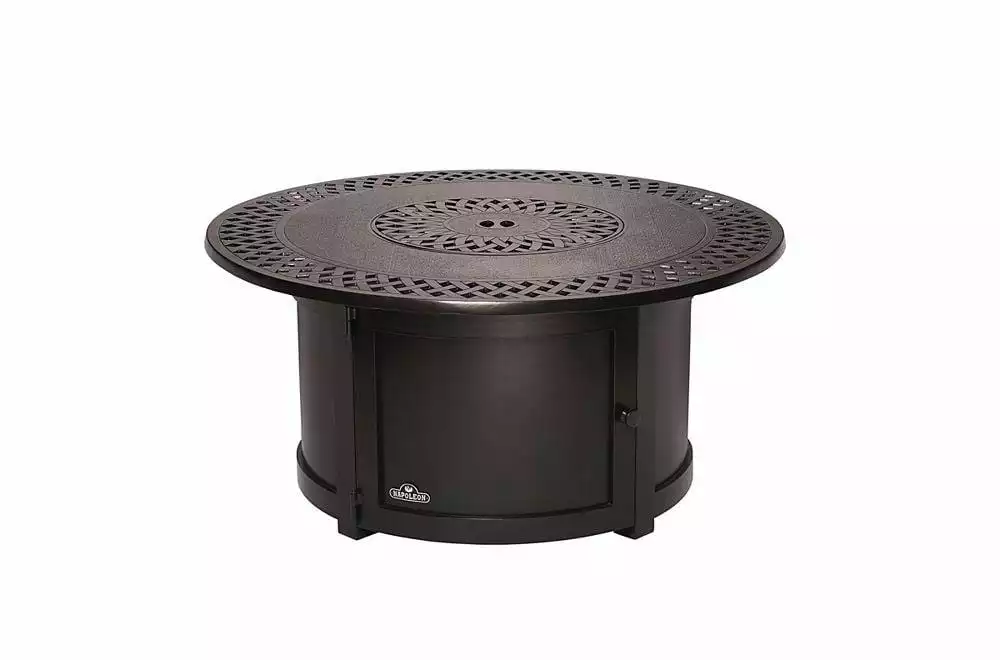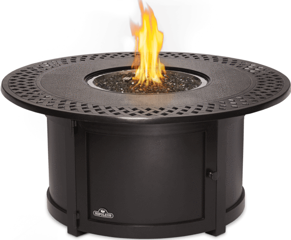 Entertain your friends and family in luxury and style with the Kensington Round Patioflame® Table. Lightweight and rust-resistant, the aluminum body allows the table to be moved comfortably around your backyard depending on your desired situation. A rustic bronze finish with a woven pattern, lends a subtle luxury, which is further customizable with the addition of colored glass. The Napoleon Kensington Round Patioflame® Table includes a matching burner cover and an access door to hide the propane tank. Use the Napoleon Kensington Round Patioflame® Table to extend your entertaining well past dark.