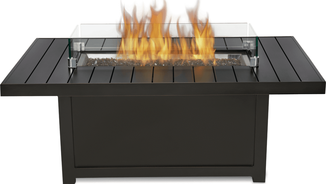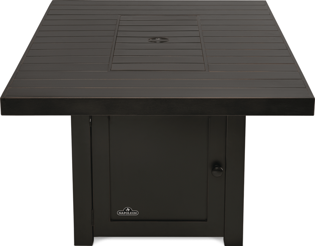The perfect outdoor living space has a comfortable place to relax, a place to set your drinks and gather around, a place that is the focal point. Napoleon’s St. Tropez Rectangle Patioflame® Table is the perfect addition to your outdoor living space. It features a classic, linear design that will match any outdoor decor. The rustic bronze finish gives an antique style, while the linear gas burner adds a modern flair with a ribbon of flame. A stylish glass ember bed reflects the light of the flames warming you and providing a cozy atmosphere. The St. Tropez Rectangle Patioflame® Table puts out 60,000 BTU’s of heat providing beautiful dancing flames, and light for your outdoor space. The table itself hides the propane tank behind an easy to access door.