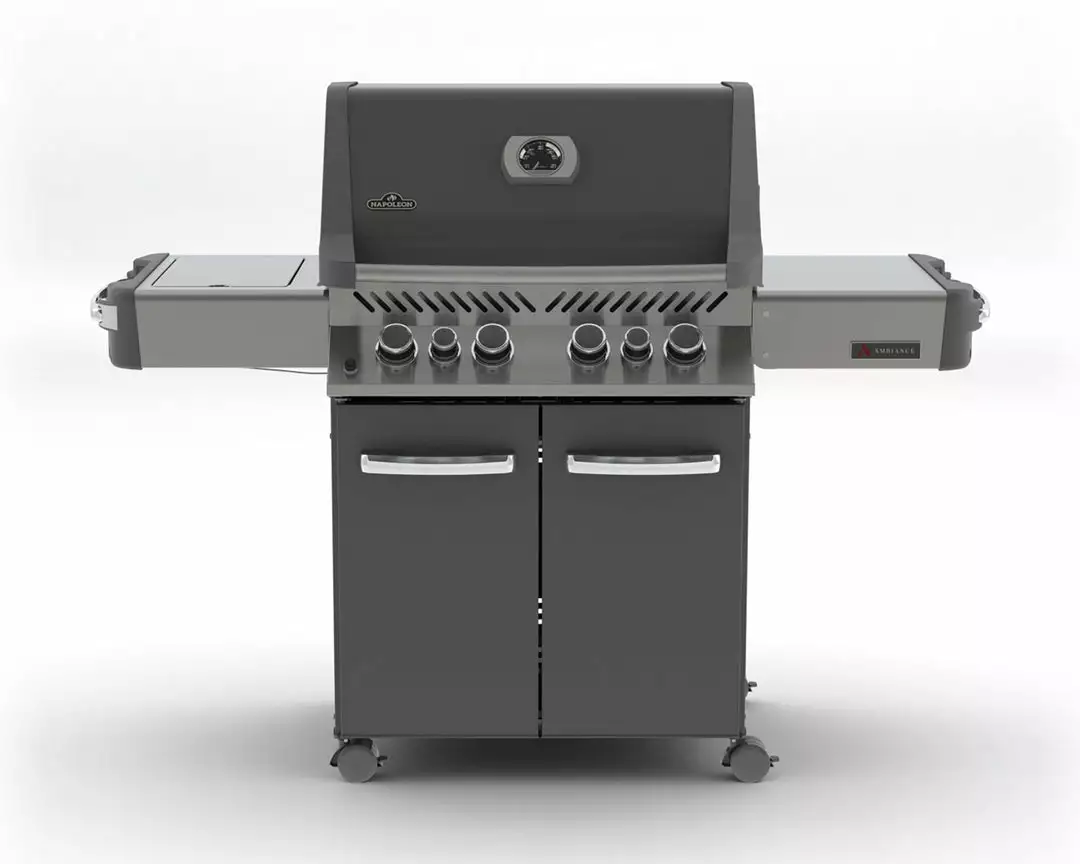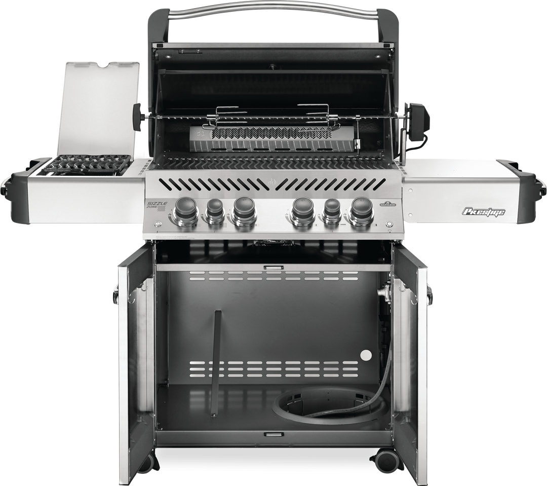 The Napoleon Prestige® 500 BBQ (Ambiance Special Edition) with Infrared Side and Rear Burners is the total grilling package; constructed from high quality stainless steel, this cart model has the capabilities of a full outdoor kitchen. With four main burners, an infrared rear and side burner, this grill can cook meals using eight unique cooking styles. Grill for a crowd with a capacity for up to thirty hamburgers, and up to eight more on the side burner. You’ll know it’s a Napoleon with the Iconic WAVE™ cooking grids for those distinctive sear marks. Not just durable on the outside; under the lid, is the same quality stainless steel used for the basin, tube burners, dual-level sear plates, and cooking grids. Seven stainless steel sear plates provide extra surface area for any drippings from your food to vaporize, avoiding flare-ups. Never leave your barbecue on again as all the Prestige® series grills come with the SafetyGlow Feature where the control knobs glow red when the burner is on.