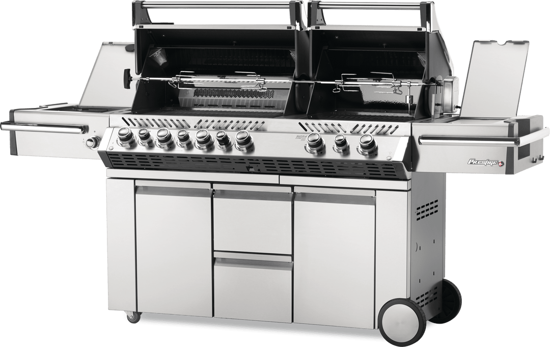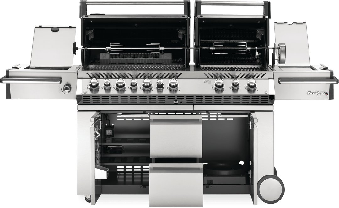 Napoleon’s Prestige PRO™ 825 Propane Gas Grill with a Power Side Burner and Infrared Rear and Bottom Burners proves that two heads are better than one. On the outside, a shining stainless steel body provides durability against the elements while chrome details add luxury. The LED Spectrum NIGHT LIGHT™ Control Knobs have near limitless color options making night-time entertaining a breeze; they also glow red when the gas is left on as a safety feature. You’ll know it’s a Napoleon with the iconic WAVE™ cooking grids for those distinctive sear marks. The main grill head is big enough to grill for a crowd and provides loads of gas powered cooking, including turning your grill into a smoker with the integrated smoker tube and dedicated burner. The second head features two ceramic infrared burners that reach high heat in seconds, ideal for searing restaurant quality steaks. The Prestige PRO™ 825 also has a two-stage power side burner with a reversible cooking grid ideal for sauces, sautes and side dishes. Enjoy evenly cooked restaurant style meals with the rear infrared burners and rotisserie.