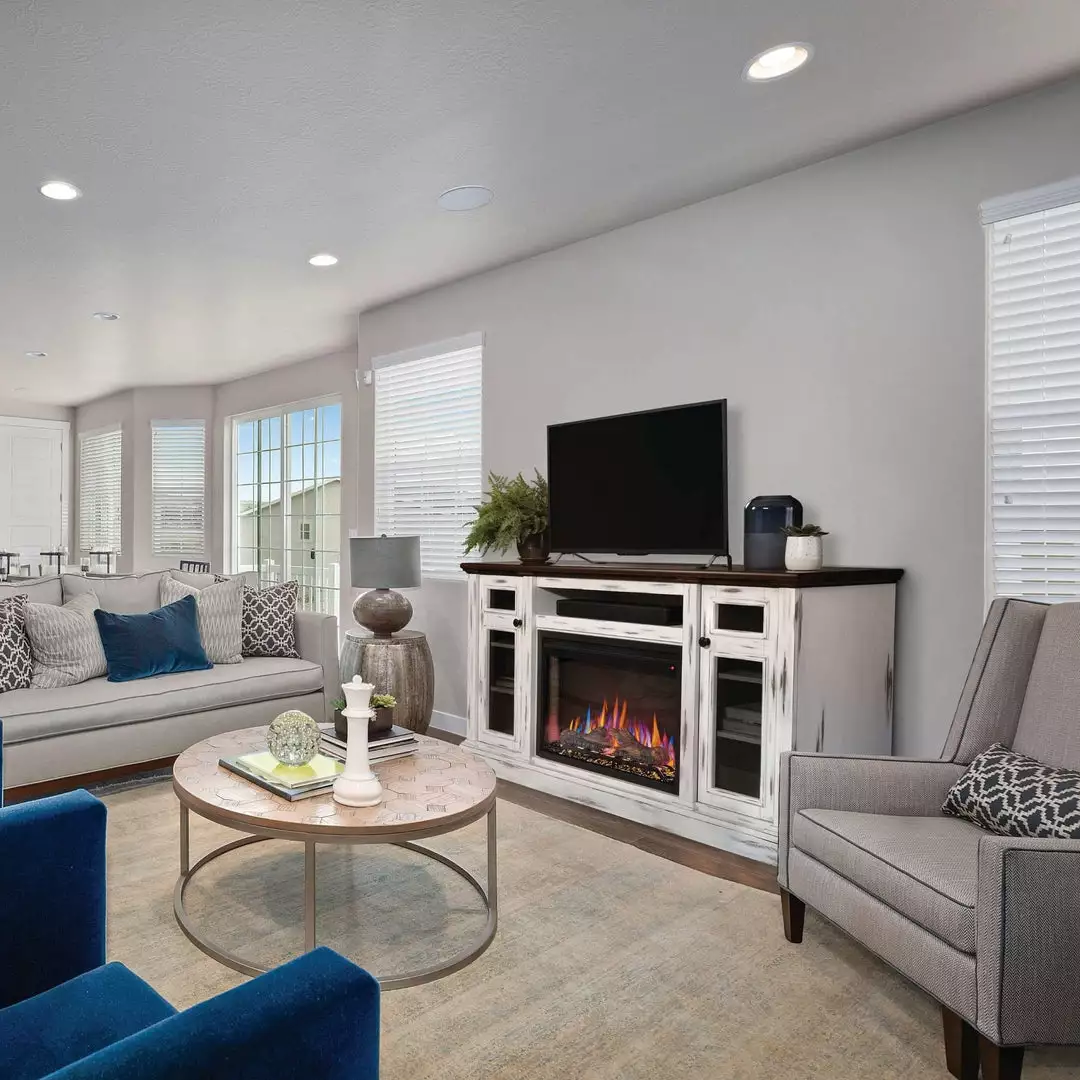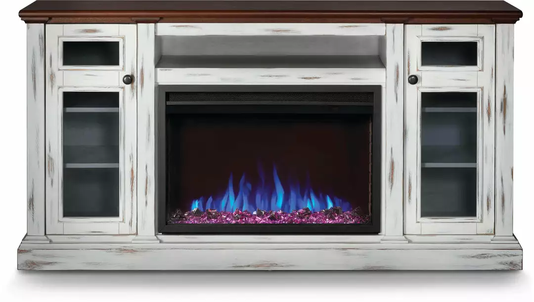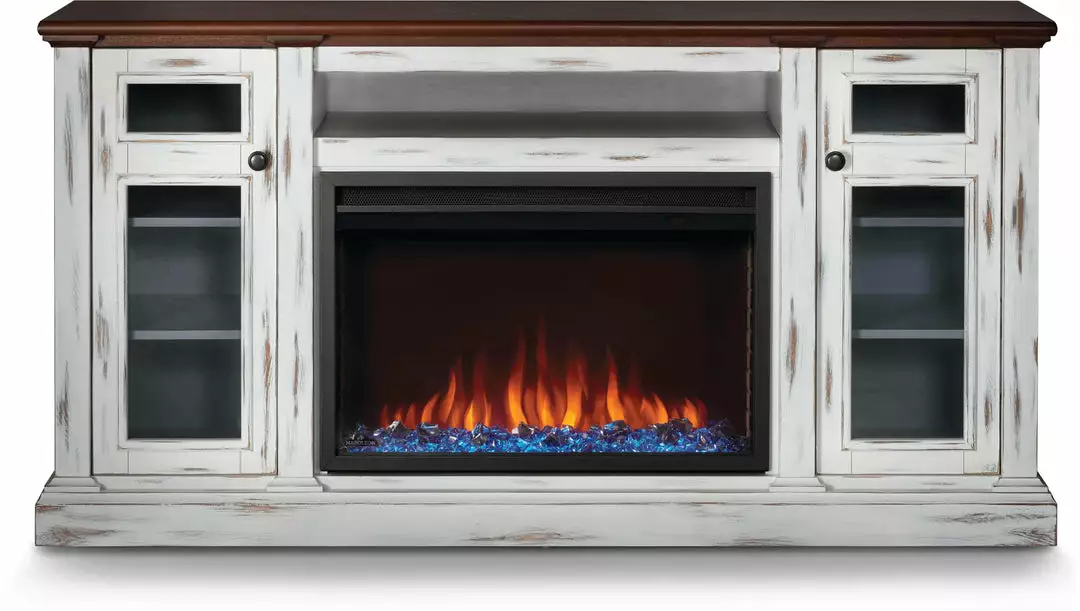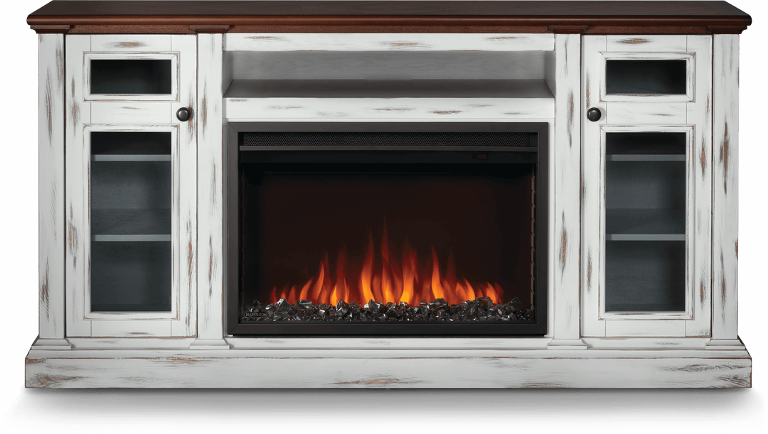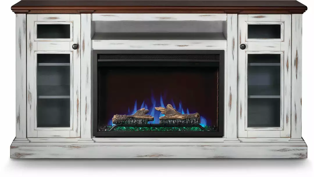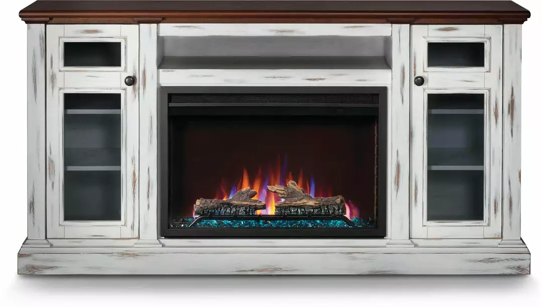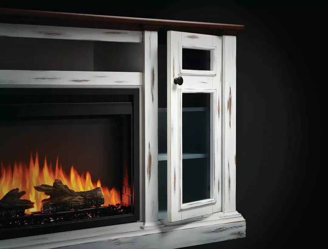 With its distressed white finish and cherry wood finished top the Charlotte Electric Mantel Package will make any space feel cozy. Perfect for offices, commercial spaces, dorms, living areas and bedrooms, the rustic styling will add a beautiful focal point to any room. The included Cineview 30 electric fireplace provides two-stage heating, with a low energy and boost mode. Get the look you want with the included burnt oak log set or the black crystal media. Adjust the flame speed and brightness using the integrated touch control panel and premium display. The Charlotte mantel package can easily become the hub of your entertainment area with electric media and wire management that are cleverly hidden. Complete your space with the beautiful Charlotte Electric Mantel Package that provides flexible rustic styling, allowing you to include the luxury of a fireplace in any room.
