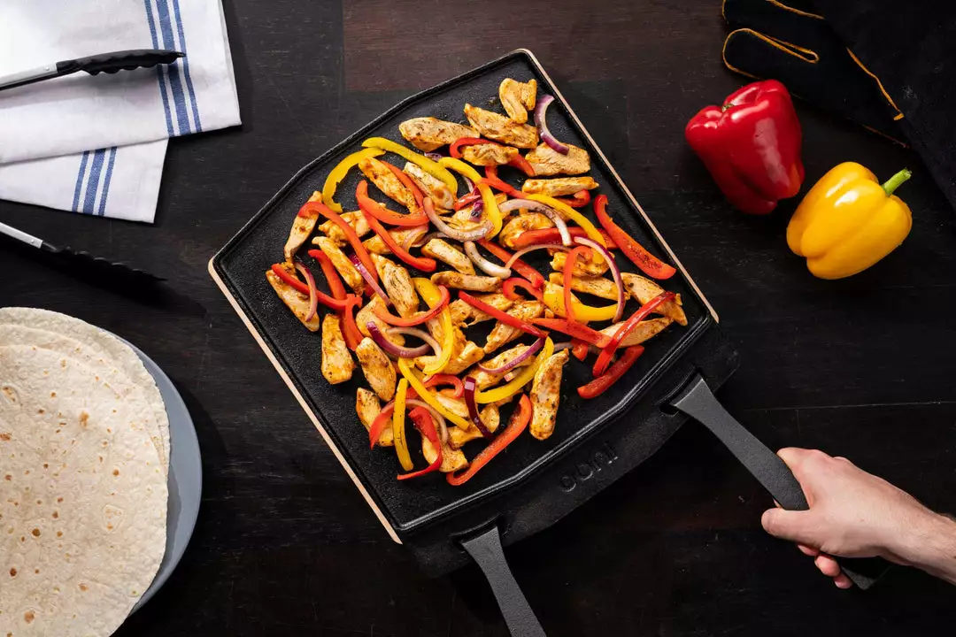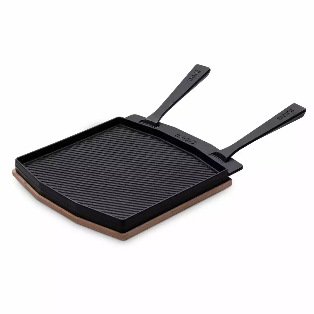 Is it a Griddle? Is it a Sizzler? It’s both! Say hello to the Ooni Dual-Sided Grizzler Plate. Use the versatile smooth Sizzler side for fajitas or frying eggs, or flip and use the Ooni Grizzler ribs for those picture perfect seared grill marks on the meats. Use the bespoke designed removable handles to safely move the Ooni Dual-Sided Grizzler Plate in and out the oven when hot, or serve it straight to the table on the included beech wood serving board.