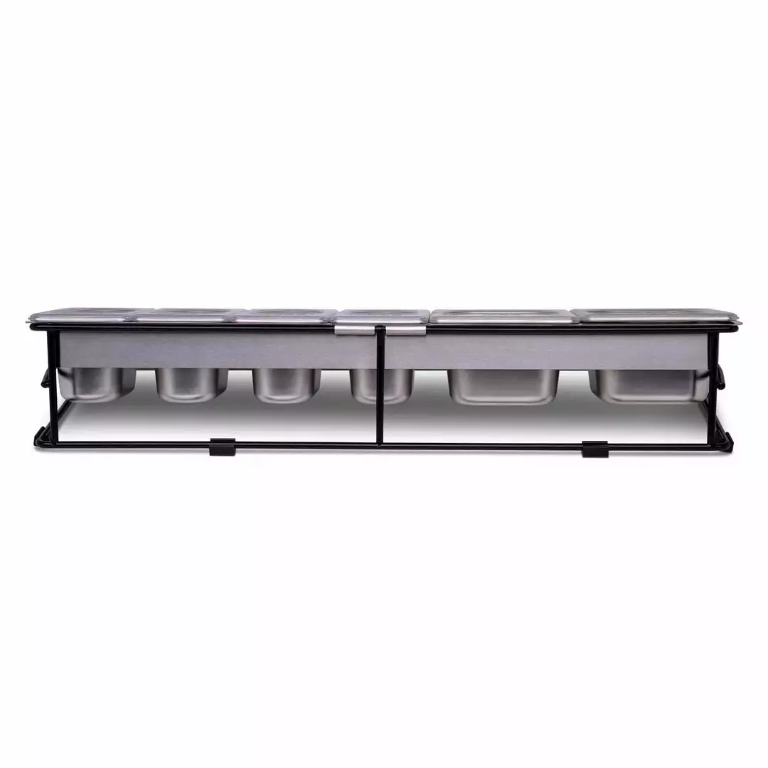 The two 1.6L and four 0.8L Ooni Pizza Topping containers ensure you have plenty of toppings to keep the pizza flowing. The custom-fit clear lids for each container means they can be easily stacked and stored in the fridge. The weather-resistant, powder-coated frame and stainless steel cover fit perfectly on our Ooni Modular Tables and it is easy to transport for cleaning and storage. Build your outdoor kitchen and level-up your pizza prep with the Ooni Pizza Topping Station.