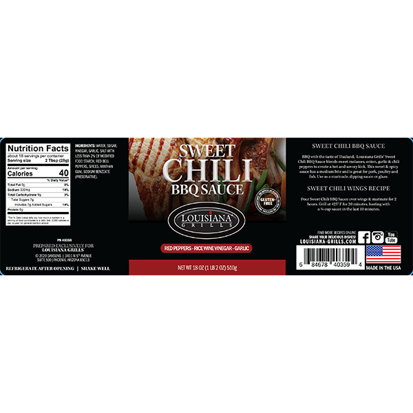 BBQ with the taste of Thailand: our Sweet Chili BBQ Sauce blends sweet molasses, onion, garlic and chili peppers to create a hot and savory kick. This sweet and spicy sauce has a medium bite and is great for pork, poultry and fish. Use as a marinade, dipping sauce or glaze.