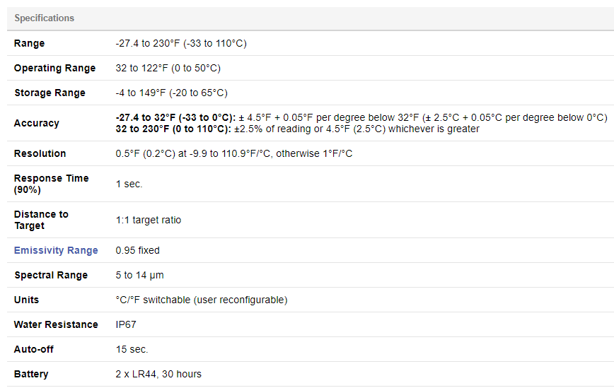 With an IP67 waterproof rating, the IR Pocket Infrared can withstand harsh environments, kitchen splashes, and an occasional mishap at the favorite fishing hole. The IR Pocket Infrared includes a wrist strap and keychain clip for convenience. A single button press changes the IR Pocket Infrared’s display from °F to °C. Don’t be fooled by the great price; this is a high quality infrared thermometer.