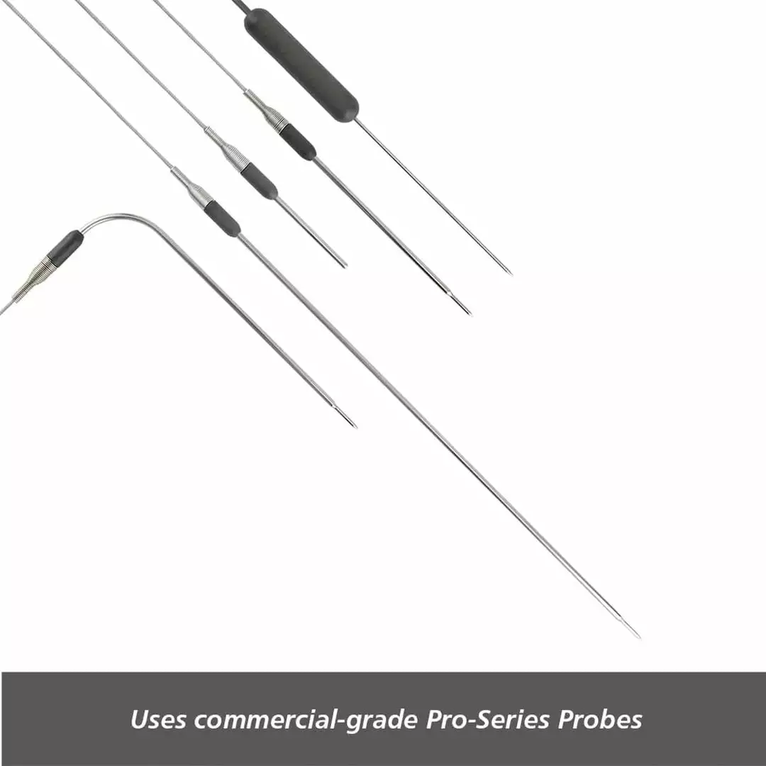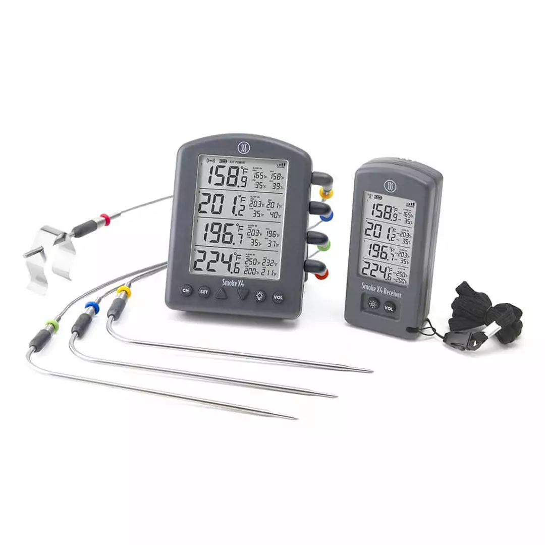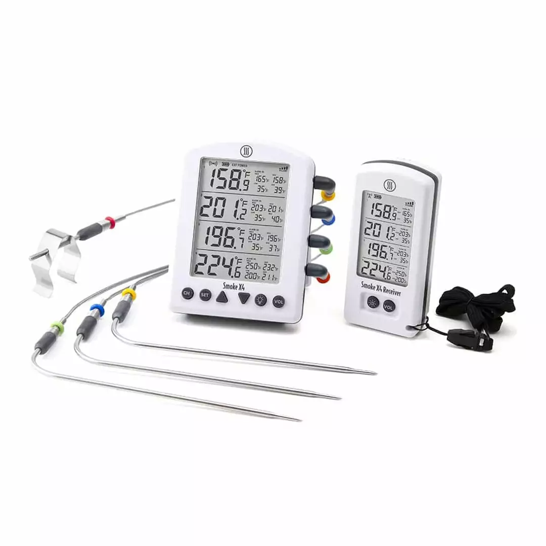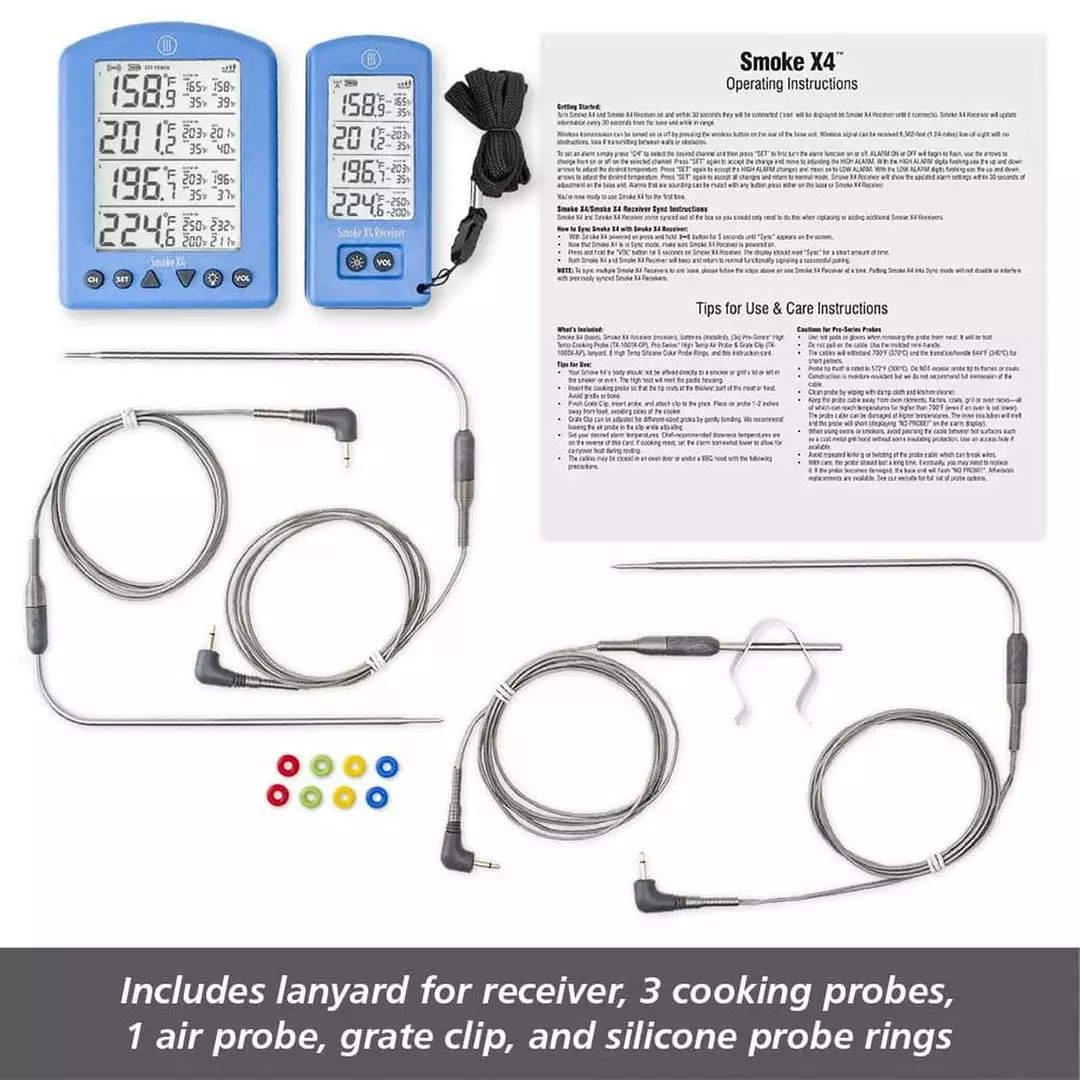 Smoke X uses commercial-grade Pro-Series probes, designed by ThermoWorks with state-of-the-art materials, built to outlast and outperform all cheaply made houseware probes. With a large, dashboard-like display, track all four channels simultaneously with high/low alarms, max/min, and adjustable volume levels. Smoke X has magnets on the back for mounting or use the convenient flip-out stand. Use Smoke X up to 330-hours on a pair of AA batteries, or plug into AC power (adapter sold separately) via USB-C for uninterrupted use. Smoke X includes control circuitry for Billows BBQ Temperature Control Fan (sold separately) so you can control your smoker temperatures over an entire cook. 9 out of 10 BBQ teams use ThermoWorks devices for winning BBQ. Use what the pros use to get award-winning results. Up your game with Smoke X from ThermoWorks, the #1 trusted name in BBQ.