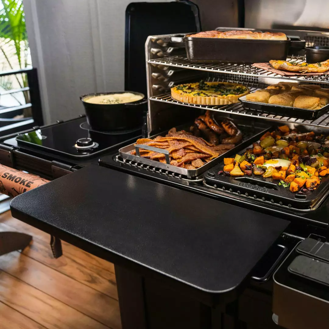This convenient Folding Front Shelf can be easily attached to the P.A.L. Pop-And-Lock® accessory rail of your P.A.L.-compatible Traeger wood pellet grill with minimal effort to give you more space for prepping, plating, resting, and more. Plus, it folds down when not in use to keep it out of the way, yet still within easy reach.
