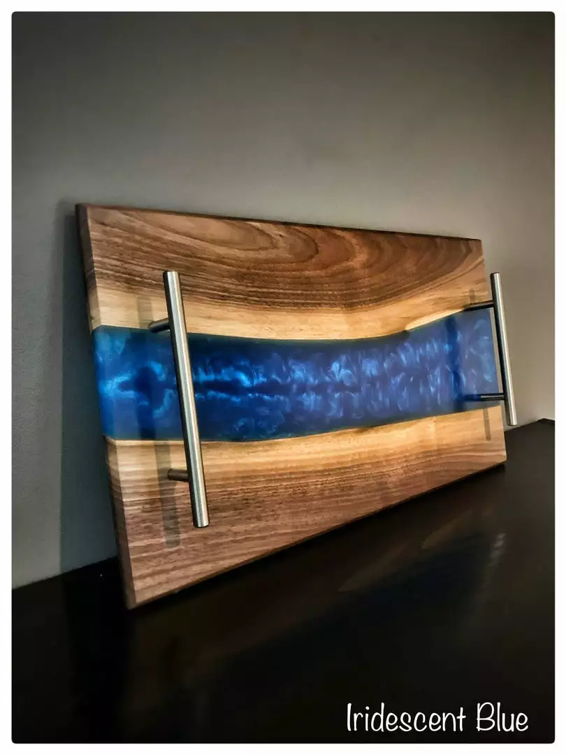 Handmade charcuterie board crafted from Black Walnut with your choice of a blue or black resin river. Handmade to order with passion and attention to detail. This serving platter is completely food safe and easy to care for. This piece is ready for years of enjoyment in your home and will be a great conversation piece when entertaining guests.