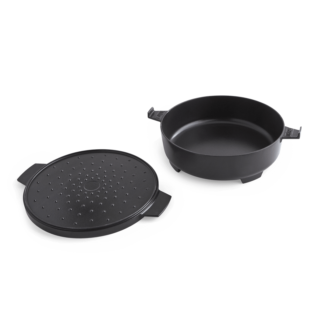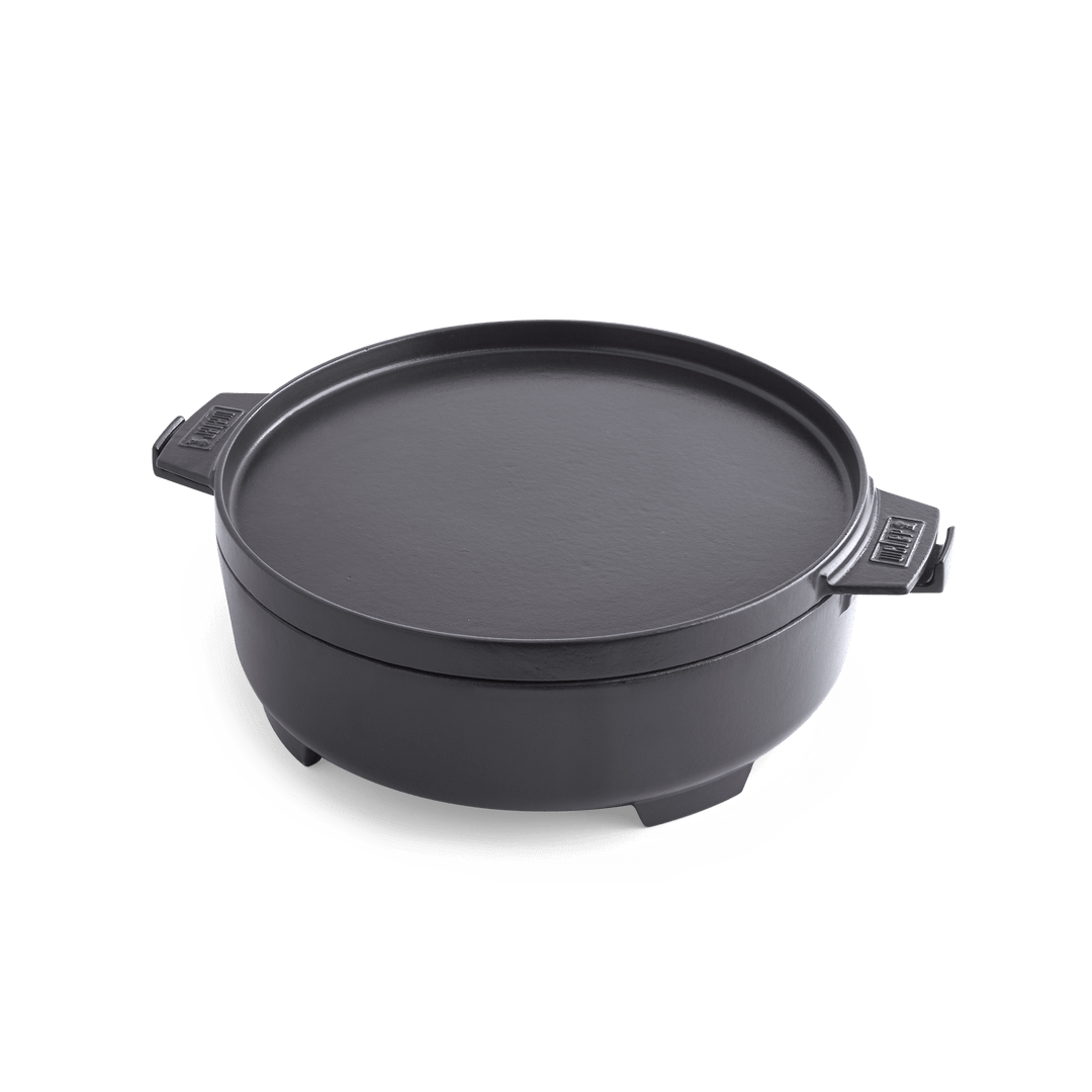 This multi-purpose cookware provides endless possibilities on the grill. The cast iron 7.25 Qt Dutch oven provides even heat distribution and retention for tender roasts or flavorful soups and stews. The dual-function lid converts to a flat griddle that toasts sandwiches or perfectly cooks chicken breasts and vegetables. The porcelain enamel finish makes it easy to clean and the two pieces stack together to save space when stored.