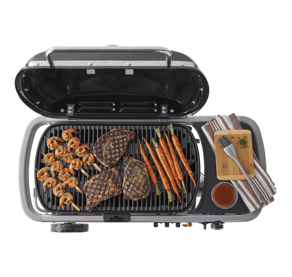 This Weber Traveler gas grill features a total cooking area of 320 square inches, 13,000 BTU of power, push-button ignition and a built-in lid thermometer.